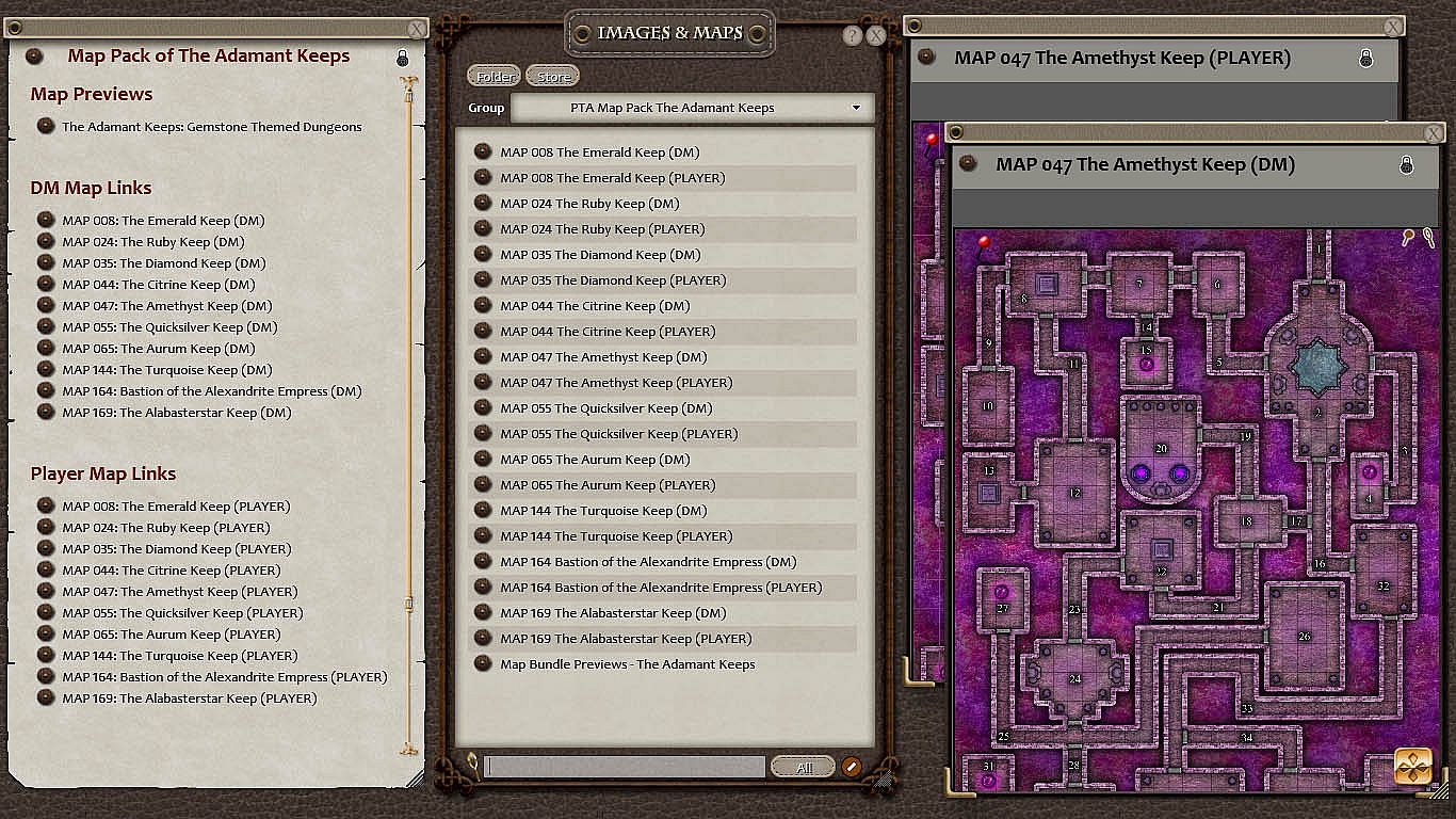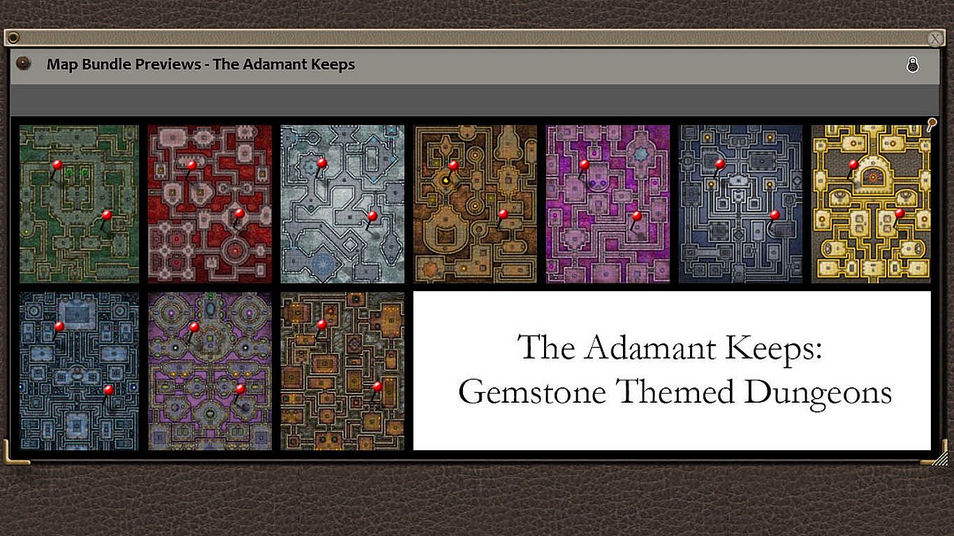 This collection of custom maps is built for the Fantasy Grounds virtual tabletop and includes 10 incredible maps related to The Adamant Keeps for use in your campaign. Both GM and Player maps are included.