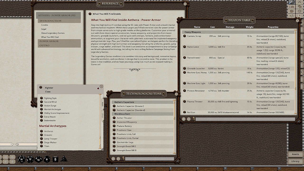 Step into high-tech sci-fi combat using the 5E rules with Power Armor and unleash martial and mechanical mayhem! Within these pages you'll find extensive rules for power armor from simple servo suits to high-grade mobile artillery platforms. Customize your armored suit with three dozen special accessories, heavy weaponry, and projectiles from boost thrusters, grenade launchers, and rail guns with entropic, hellbore, and zombiemaker ammunition, or augment your character with cybernetic automata like implanted weaponry and quickstrider legs. Plus, you'll find five specialized fighter archetypes perfect for blending physical strength with high-tech armor and weaponry including the artillerist, gravitic, jump trooper, siege walker, and titan! This book is an awesome accompaniment to any campaign world with advanced technology, including the best-selling Aethera Campaign Setting from Legendary Games. Whether you play full-on sci-fi or blend future tech with fantasy, this 28-page 5th Edition supplement will Make Your Game Legendary! Adapted for Fantasy Grounds by: Connor BatesRequires: An active subscription or a one time purchase of a Fantasy Grounds Full or Ultimate license and any ruleset. Compatible with Fantasy Grounds Unity or Fantasy Grounds Classic