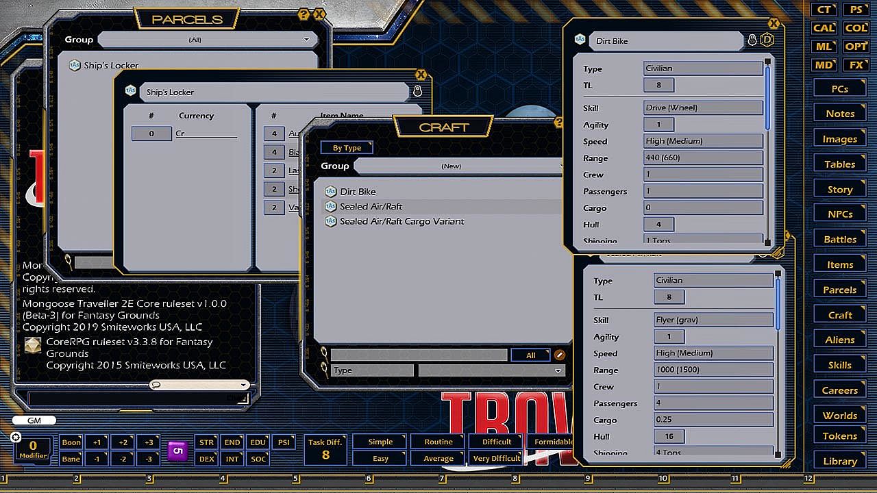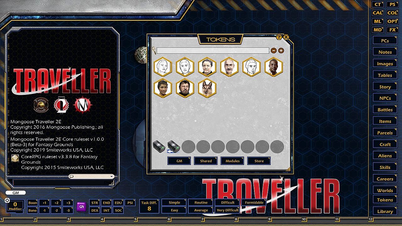 Requires: An active subscription or a one time purchase of a Fantasy Grounds Full or Ultimate license and a one time purchase of the Traveller 2E (Mongoose) ruleset.