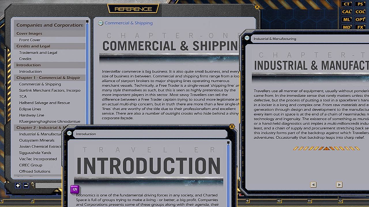 Economics is one of the fundamental driving forces in any society, and Charted Space is full of groups trying to make a living - or better, a big profit. Companies and Corporations presents some of these groups along with their agenda, their methods and any dark secrets they may have. These commercial bodies are much smaller than the great Megacorporations, but some of them are major players in their own field. They might be encountered as patrons, allies, opponents or victims of the Travellers' schemes, adding depth and colour to that generic row of starport cargo brokers and putting a backstory to that pile of freight containers.