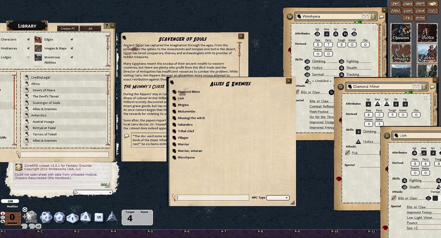 Requires: An active subscription or a one time purchase of a Fantasy Grounds Full or Ultimate license and a one time purchase of the Savage Worlds ruleset as well as a one time purchase of the Rippers Resurrected Player’s Guide and Rippers Resurrected Game Master’s Handbook (GM only).