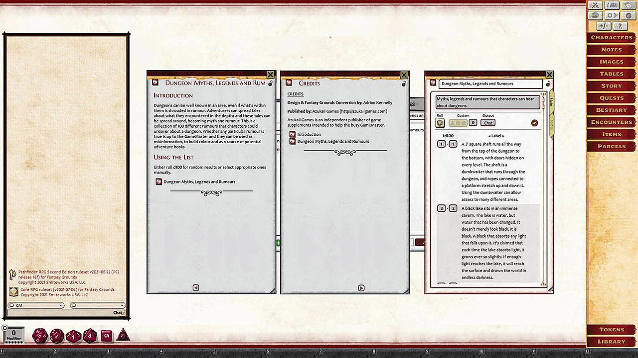 This is a collection of four different modules that add rumours, notes and books to your Pathfinder 2nd Edition game. Each of the four modules is detailed more thoroughly below.