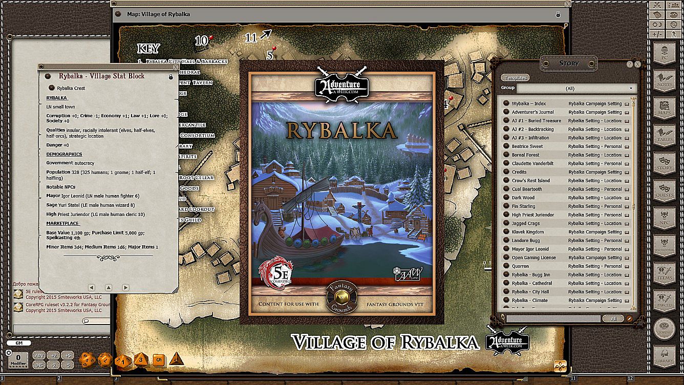 This Fantasy Grounds module for 5E includes all locations, characters, maps, and images in relation to Rybalka appearing thus far on the AaW site and in adventure releases.
