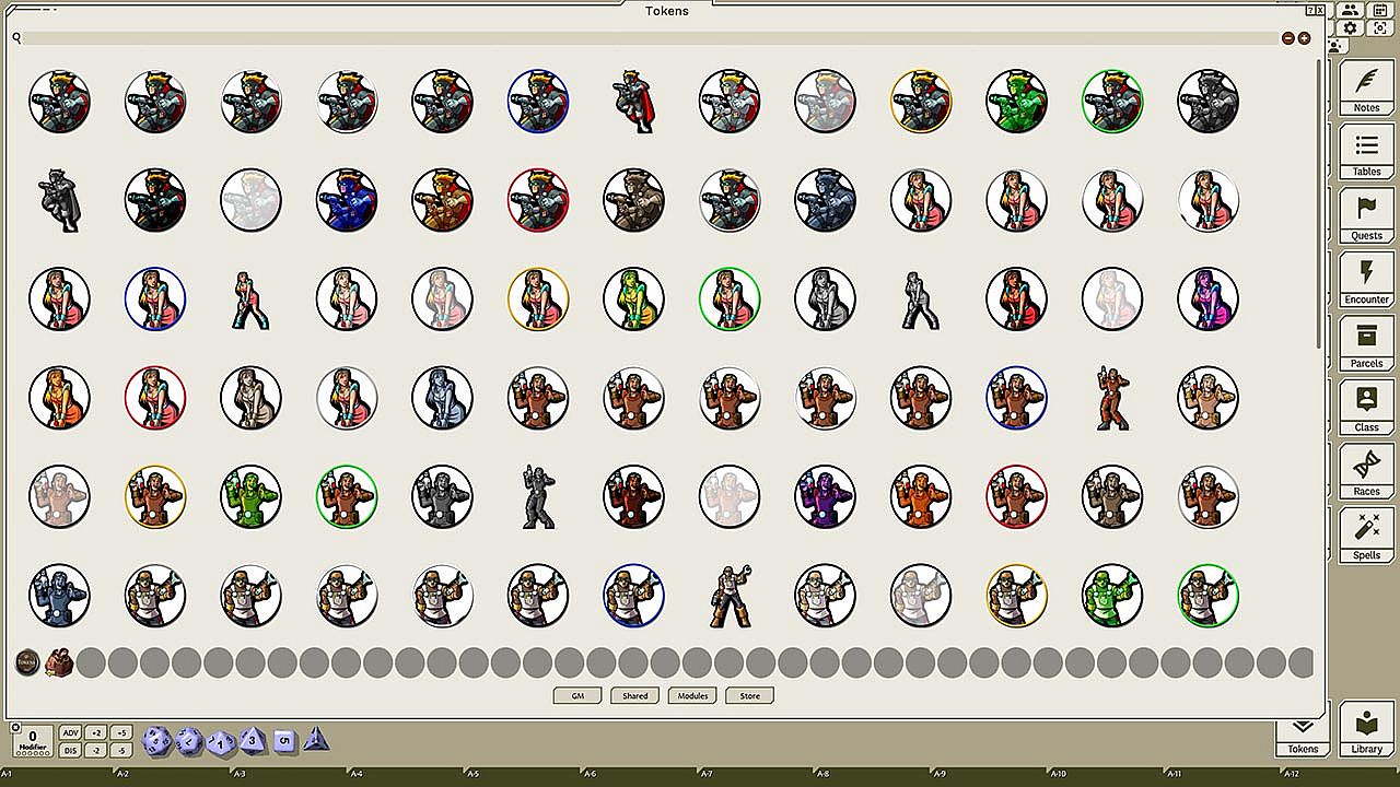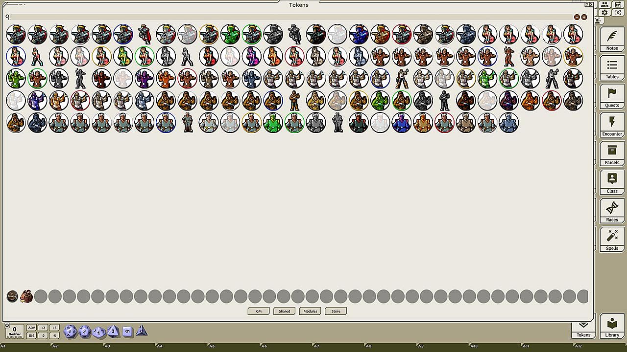 This token pack includes (ringed in black, blue, gold, green, greyscale, and silver, as well as ethereal, invisible, stone-skinned, sand-skinned, and altered state versions):