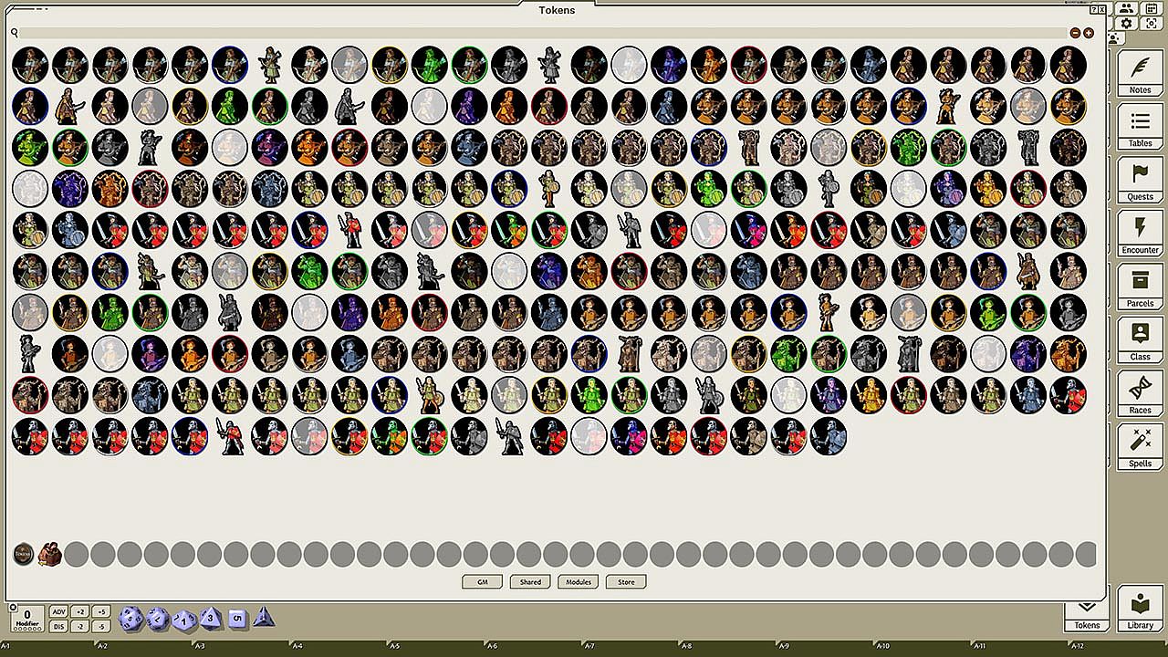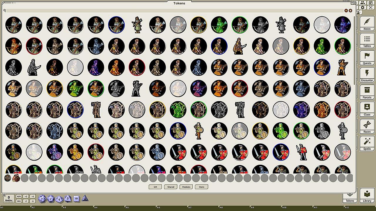 This token pack includes (ringed in black, blue, gold, green, greyscale, and silver, as well as ethereal, invisible, stone-skinned, sand-skinned, and altered state versions):