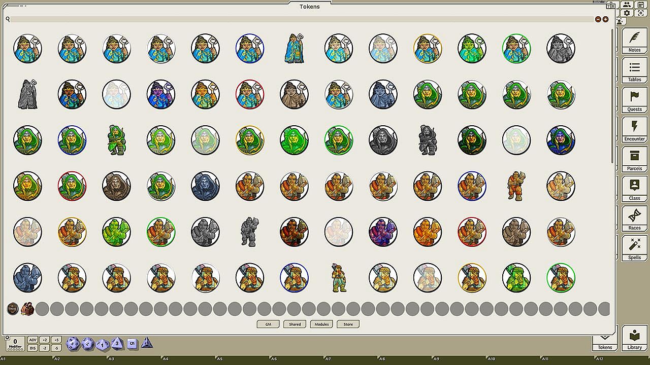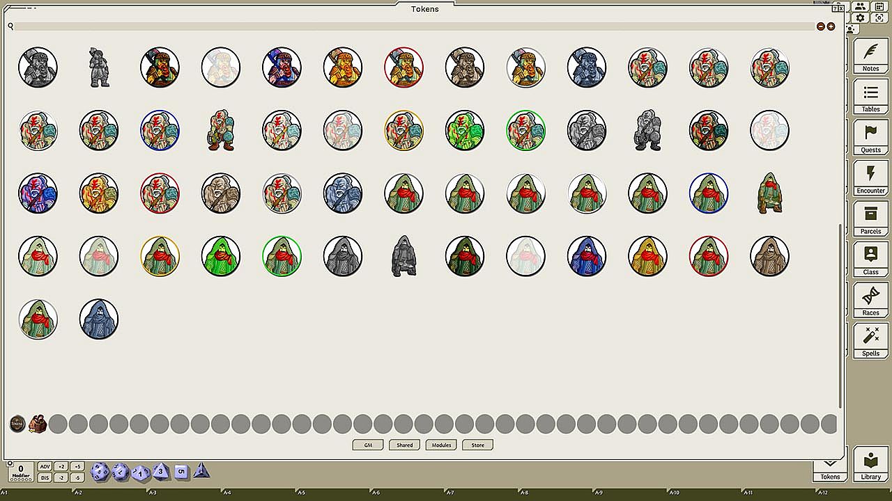 This token pack includes (ringed in black, blue, gold, green, greyscale, and silver, as well as ethereal, invisible, stone-skinned, sand-skinned, and altered state versions):
