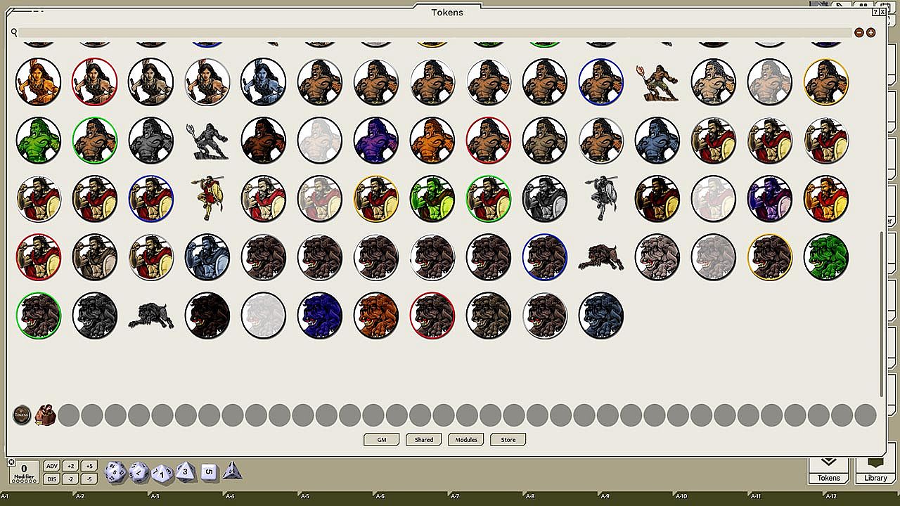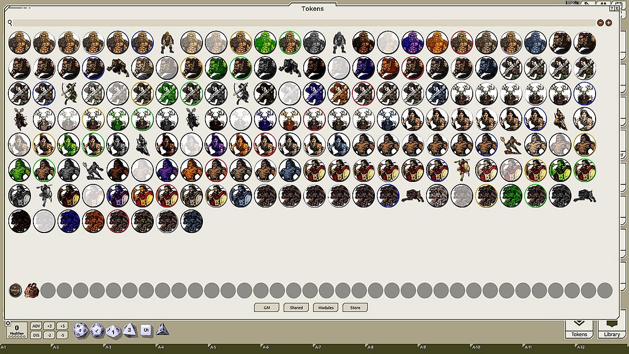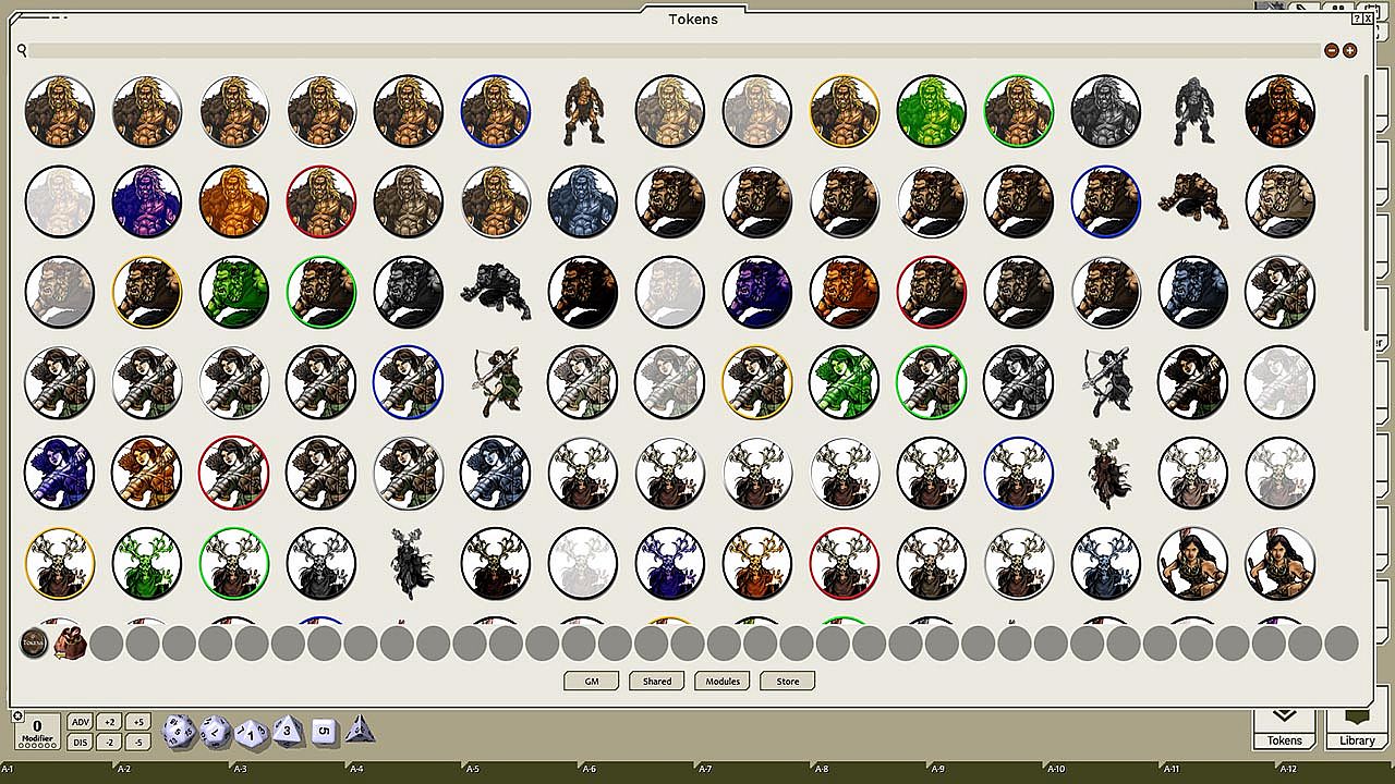 This token pack includes (ringed in black, blue, gold, green, greyscale, and silver, as well as ethereal, invisible, stone-skinned, sand-skinned, and altered state versions):