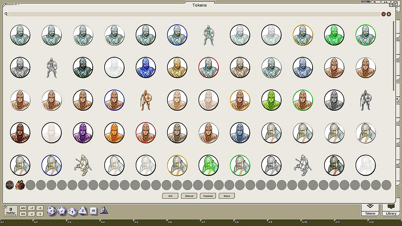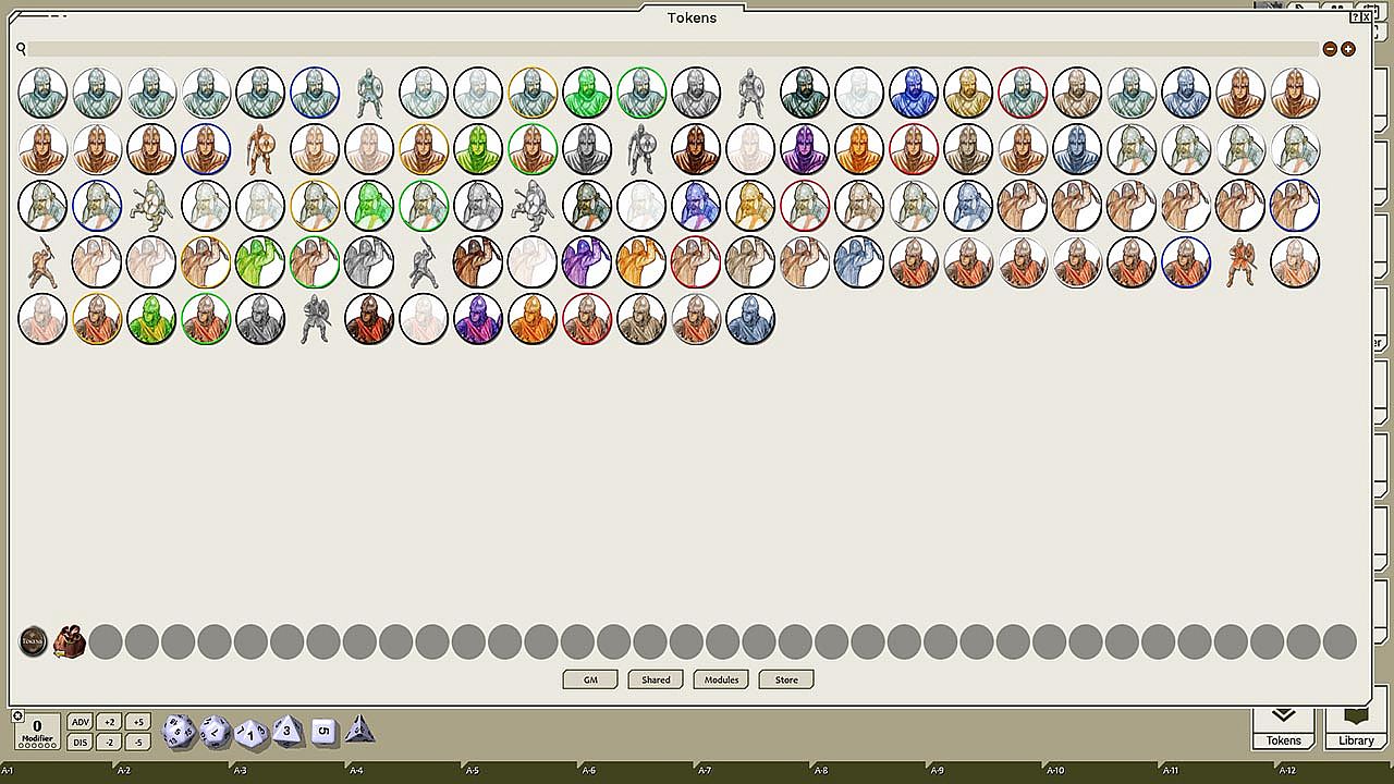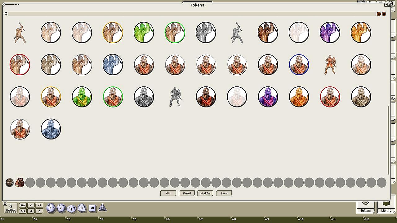 This token pack includes (ringed in black, blue, gold, green, greyscale, and silver, as well as ethereal, invisible, stone-skinned, sand-skinned, and altered state versions):