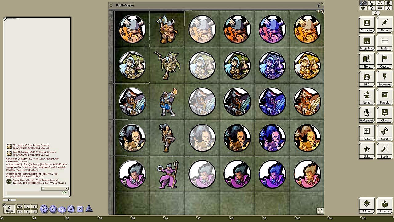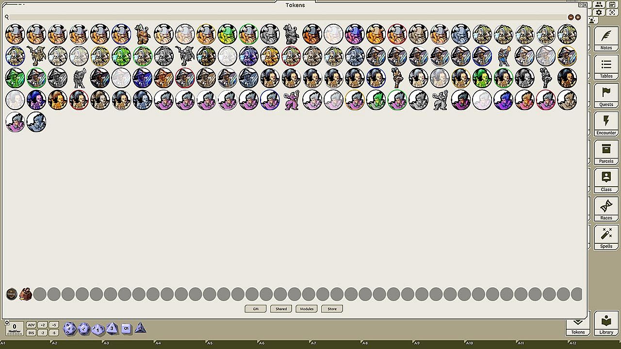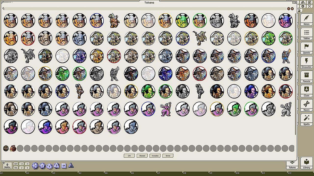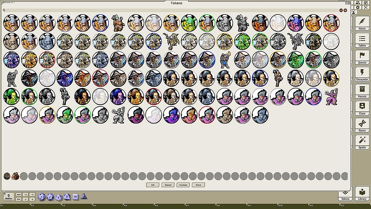 This token pack includes (ringed in black, blue, gold, green, greyscale, and silver, as well as ethereal, invisible, stone-skinned, sand-skinned, and altered state versions):
