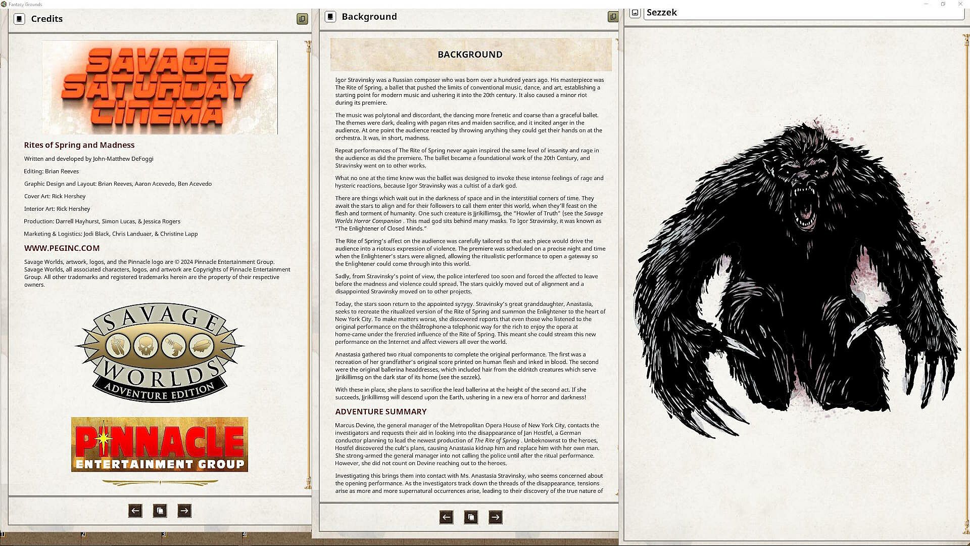 This Savage Saturday Cinema is a modern horror adventure, with ties to the Savage Worlds Horror Companion (but with few adjustments you can play it with only the core rulebook). John-Matthew DeFoggi weaves this tale around Igor Stravinsky's ballet The Rite of Spring . An ancient cult is using a special performance of the ballet for their own sinister purposes. Can the investigators of the Twilight Lodge Investigative Agency discover what's happening in time to stop it?