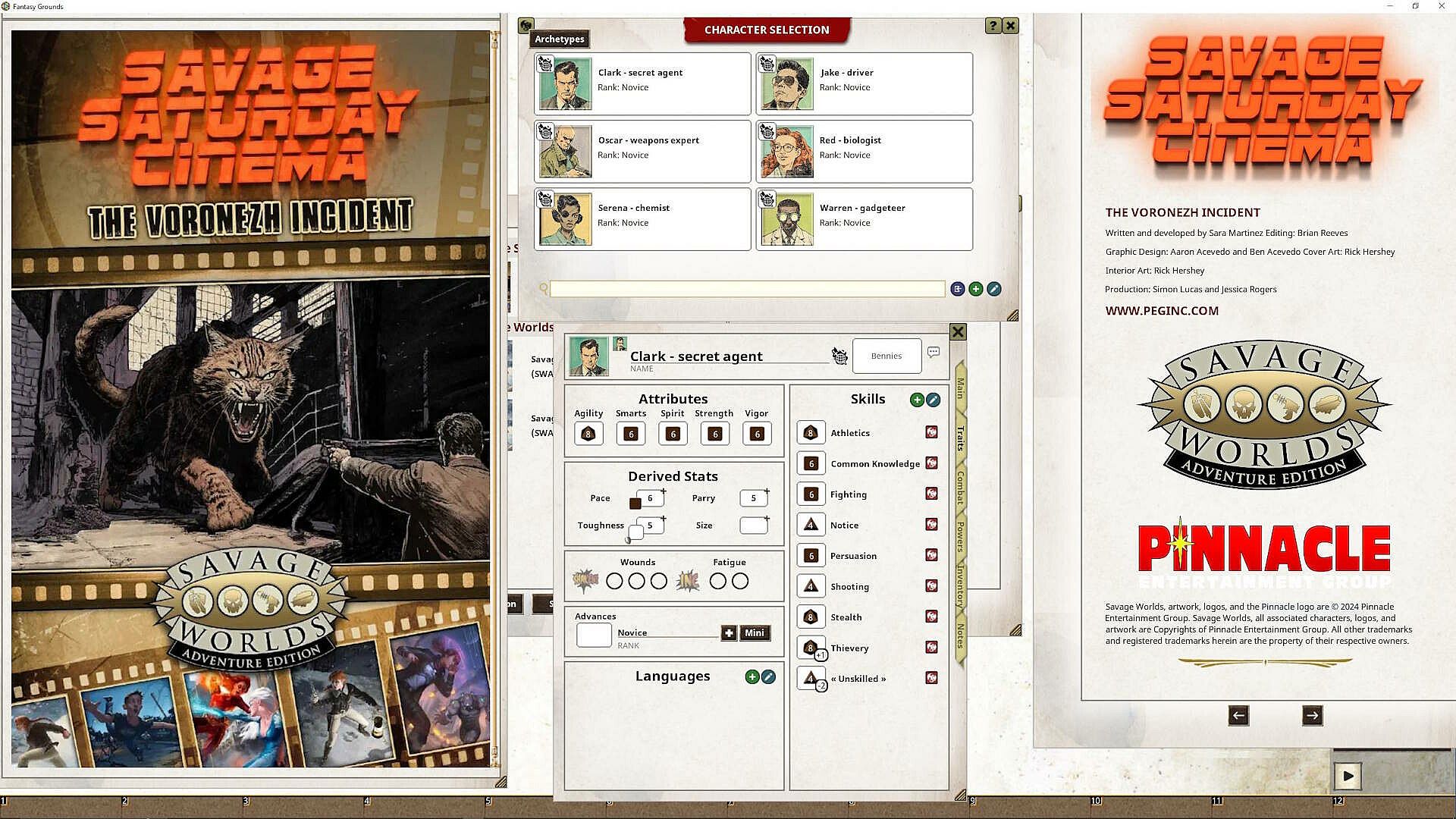 The Voronezh Incident is a pulpy, campy "spy-fi" action adventure set in the Cold War era of the early 1960s, in the vein of Jonny Quest or the Venture Brothers . The heroes are members of a team of super scientists, moderately well known as global problem solvers. They are called to investigate a report of mutated, oversized creatures plaguing a town in rural Soviet Union.Welcome to Savage Saturday Cinema, Pinnacle's line of short adventures for Savage Worlds. These scenarios are intended for a single session of play, whether at home, at a convention, or even a pick-up game at your friendly local gaming store. They can stand on their own as a complete adventure, or Game Masters may work them into ongoing campaigns as a one-off or side quest. Each adventure comes with pregenerated characters so you can get right into the action.