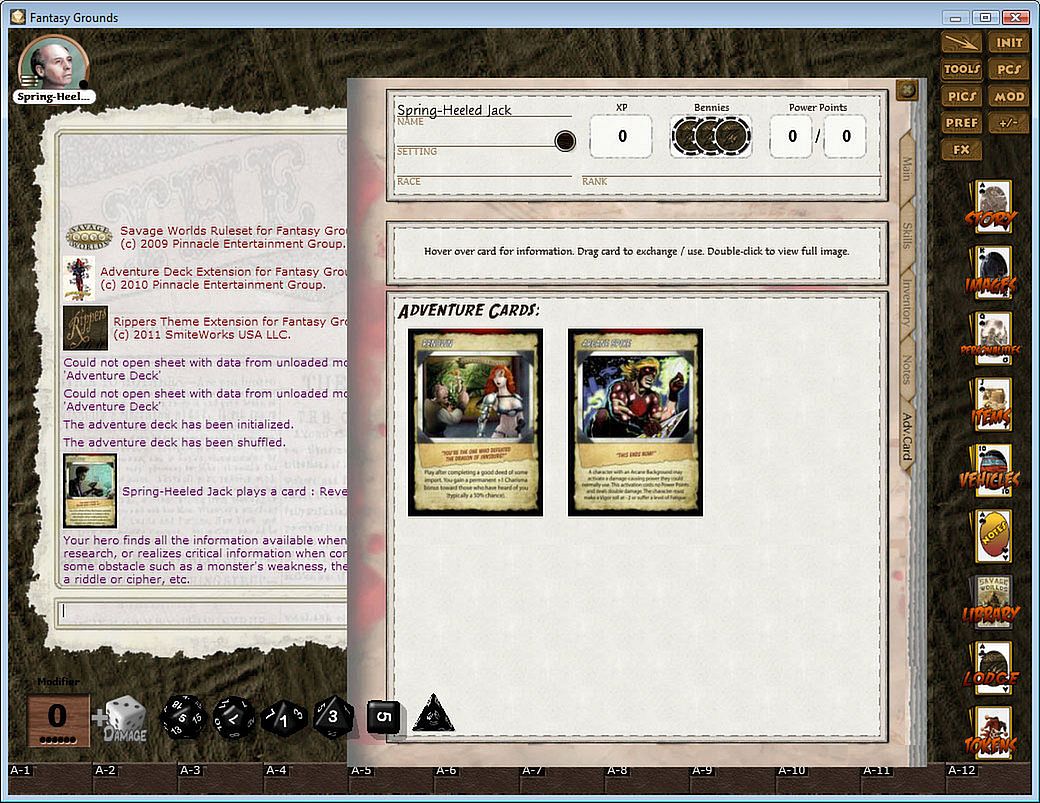 This product contains a new Tool for dealing Adventure cards to characters by simply dragging the card to the charcter sheet or the player icon, a new Adv. Card tab on each character sheet and support for seeing the card text and full images, playing the cards, re-shuffling/collecting all the cards back from the players and finally... new preferences to optionally include promo cards from several popular extensions such as Deadlands, Rippers, Super Powers, etc. A library module with a new edge and with a link to each card is also included, along with a PDF documenting all the cool new features.