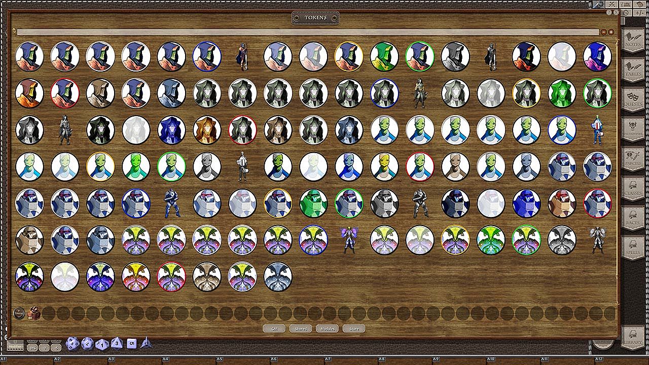 This token pack includes (ringed in black, blue, gold, green, greyscale, and silver, as well as ethereal, invisible, stone-skinned, sand-skinned, and altered state versions):