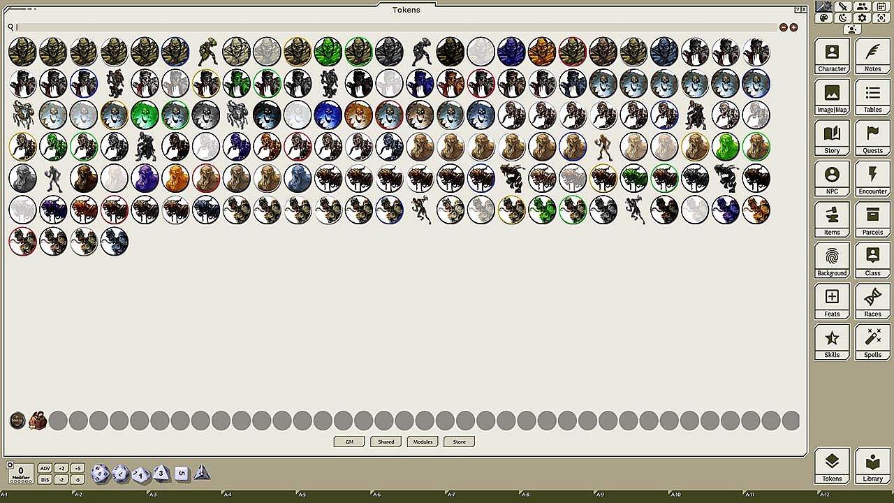 This token pack includes (ringed in black, blue, gold, green, greyscale, and silver, as well as ethereal, invisible, stone-skinned, sand-skinned, and altered state versions):