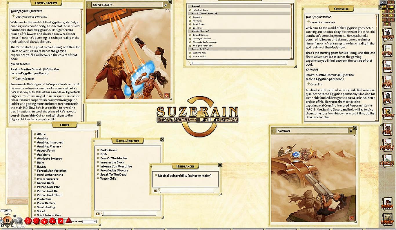 This booklet gives you six pre-generated characters from the Set Rising setting, showcasing some of the options and abilities available to players. Use them for reference, for inspiration, or to turbo-charge your gaming experience, getting into the game without having to draw up new demigods from scratch. Set Rising is part of the Suzerain Continuum.