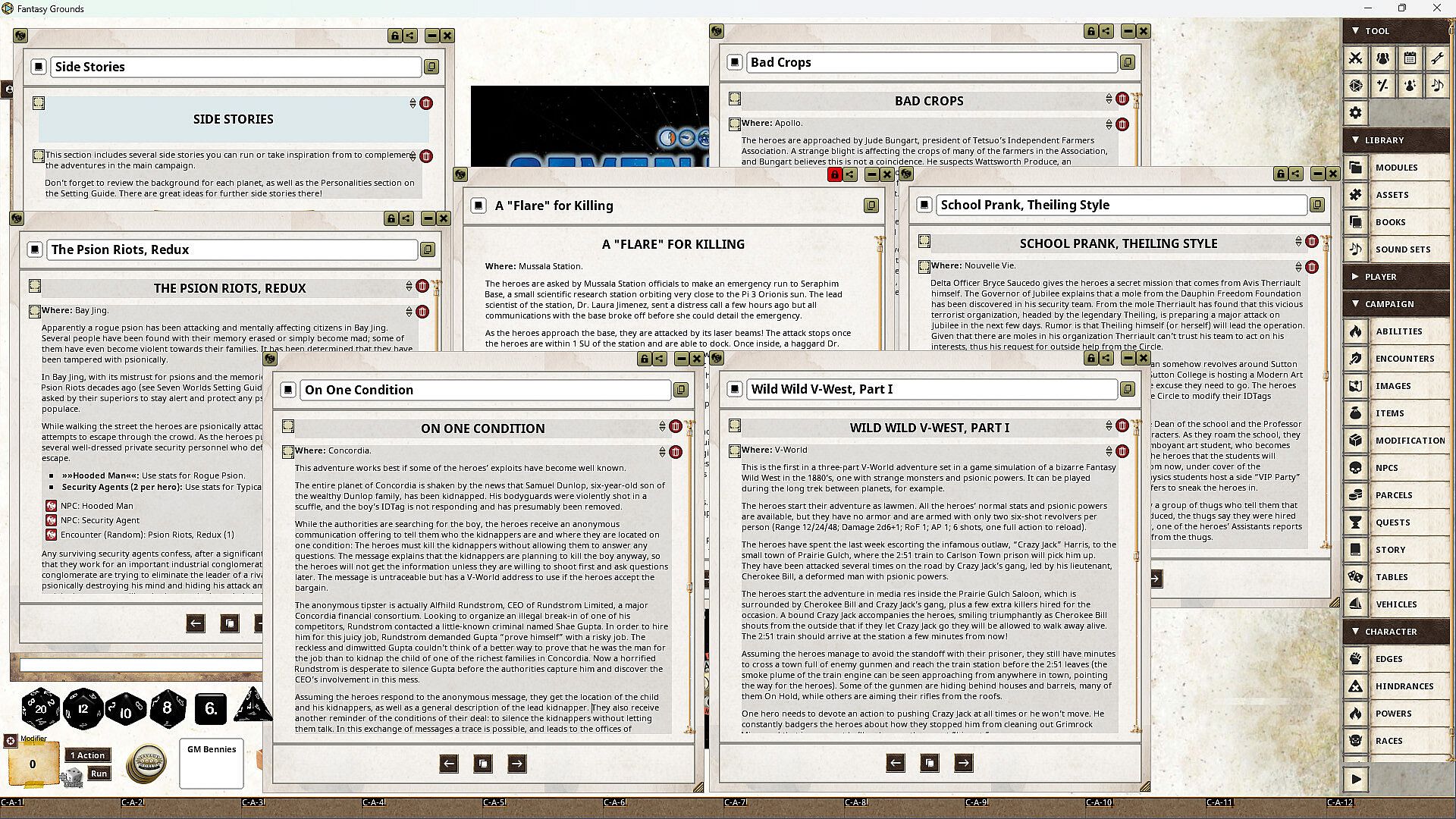 This product requires the Savage Worlds rulebook and the Seven Worlds Setting Guide to play. It contains separate modules tailored to work with both Savage Worlds Deluxe and Savage Worlds Adventure Edition versions of the underlying Setting Guide and core rulebook.