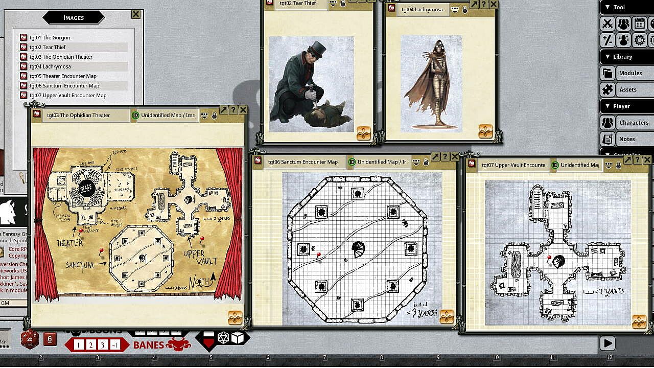 Combat encounter maps included: Theatre, Sanctum, Upper Vault