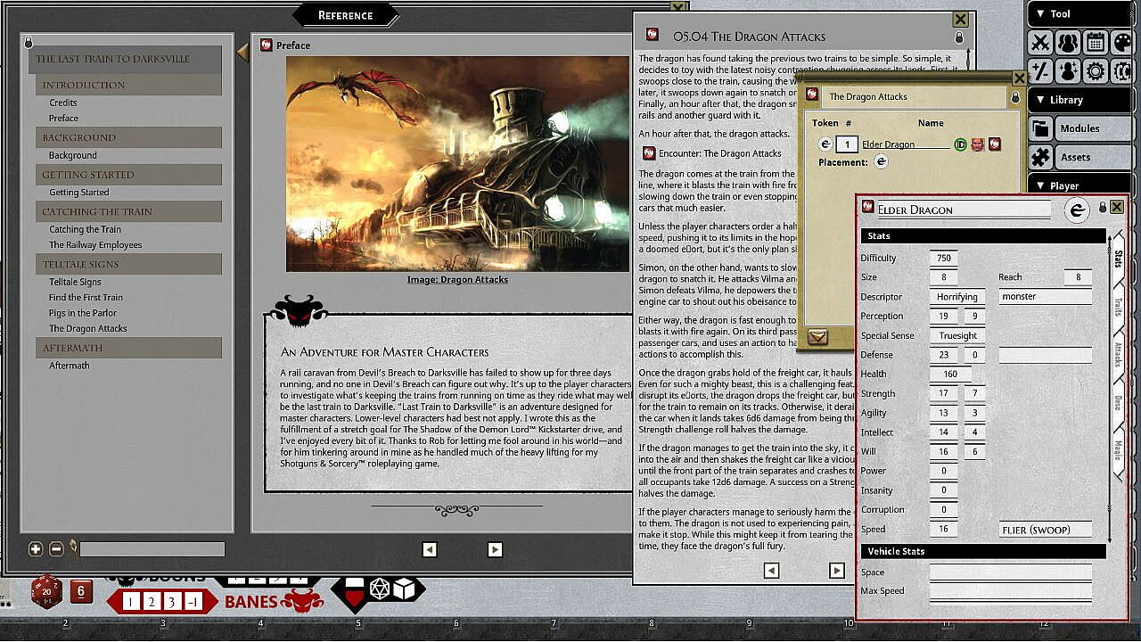 The Last Train to Darksville (Master) A rail caravan from Devil's Breach to Darksville has failed to show up for three days running, and no one in Devil's Breach can figure out why. It's up to the player characters to investigate what's keeping the trains from running on time as they ride what may well be the last train to Darksville. This adventure is designed for master characters. Lower-level characters had best not apply. Combat encounter maps included: none Adapted for Fantasy Grounds by: Kevin Heffernan Requires: An active subscription or a one time purchase of a Fantasy Grounds Full or Ultimate license and the Shadow of the Demon Lord ruleset.