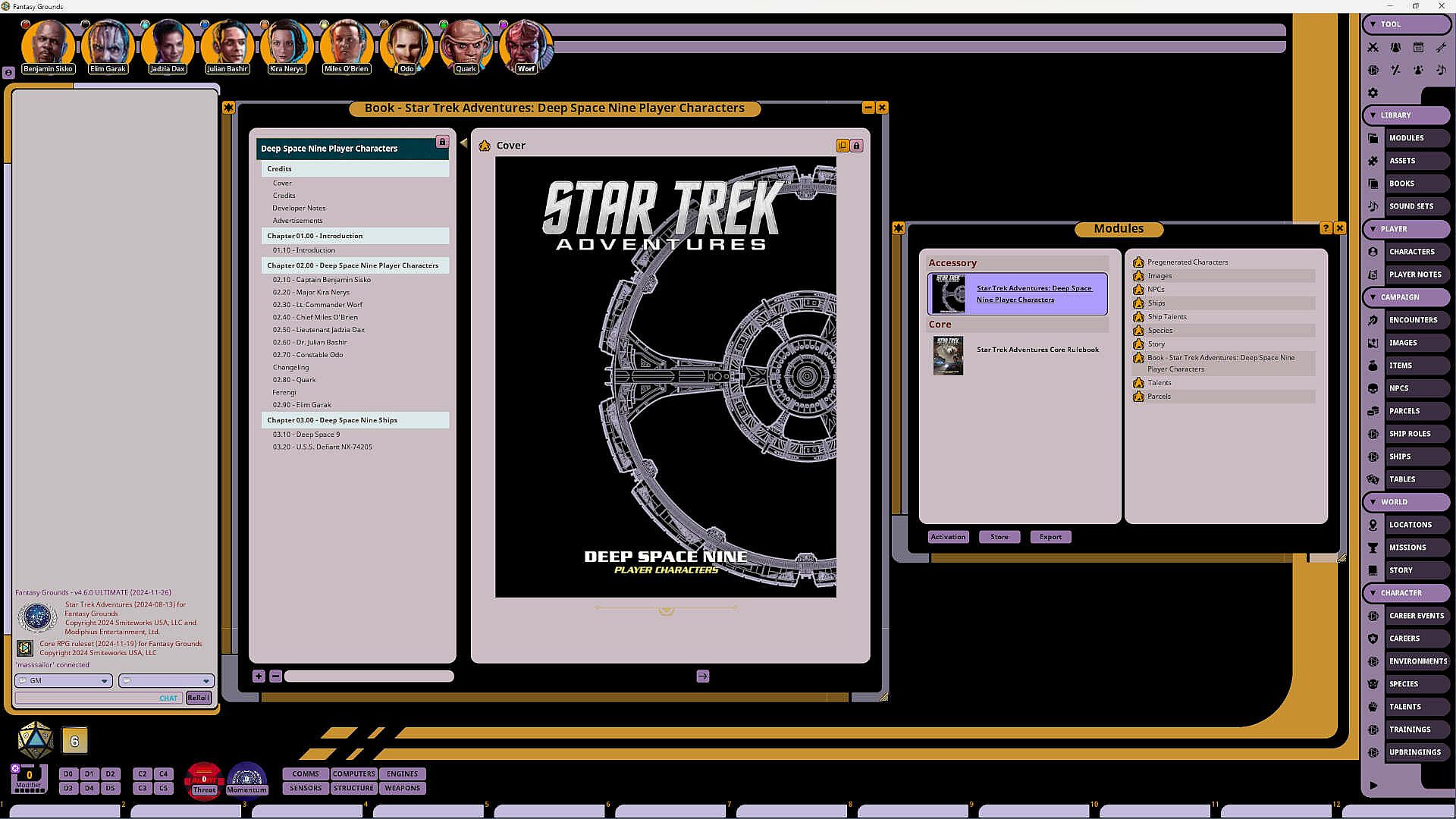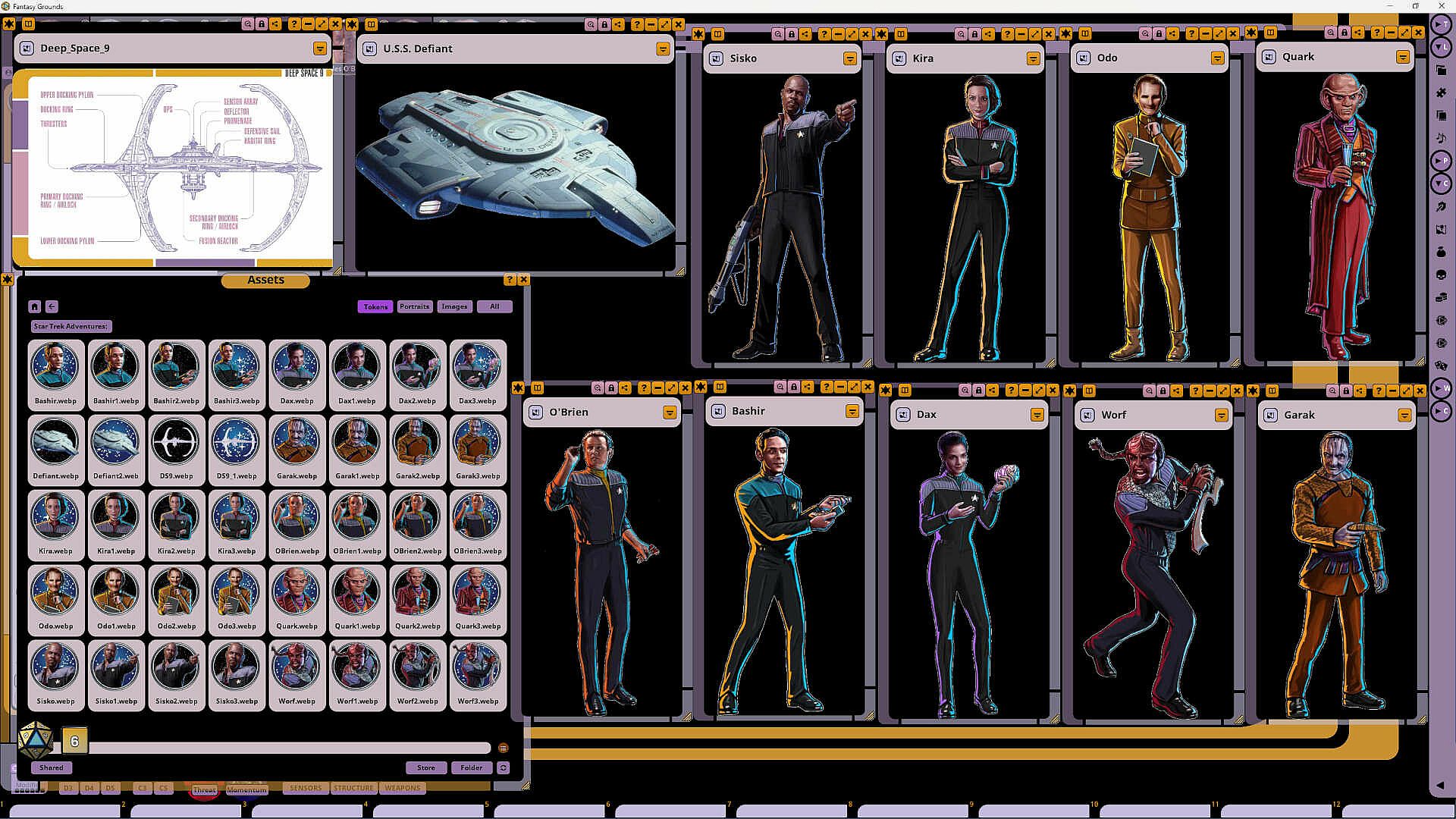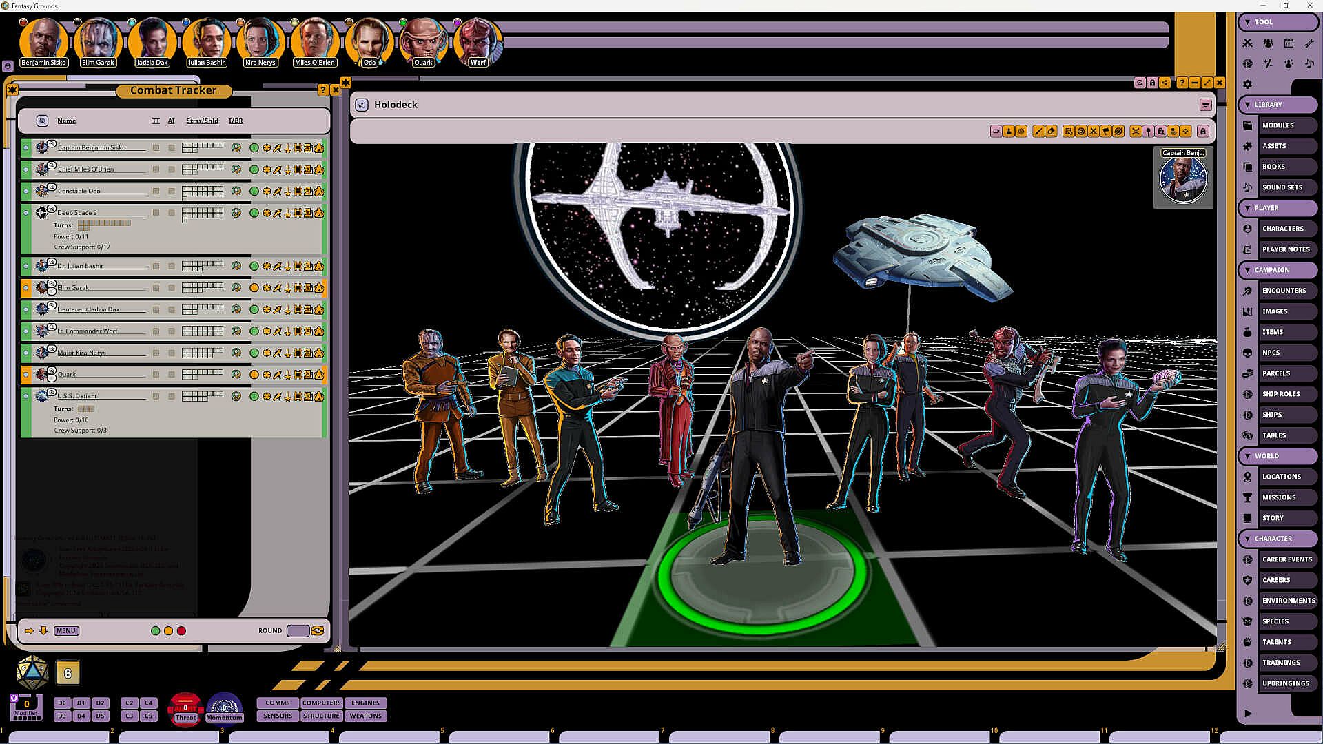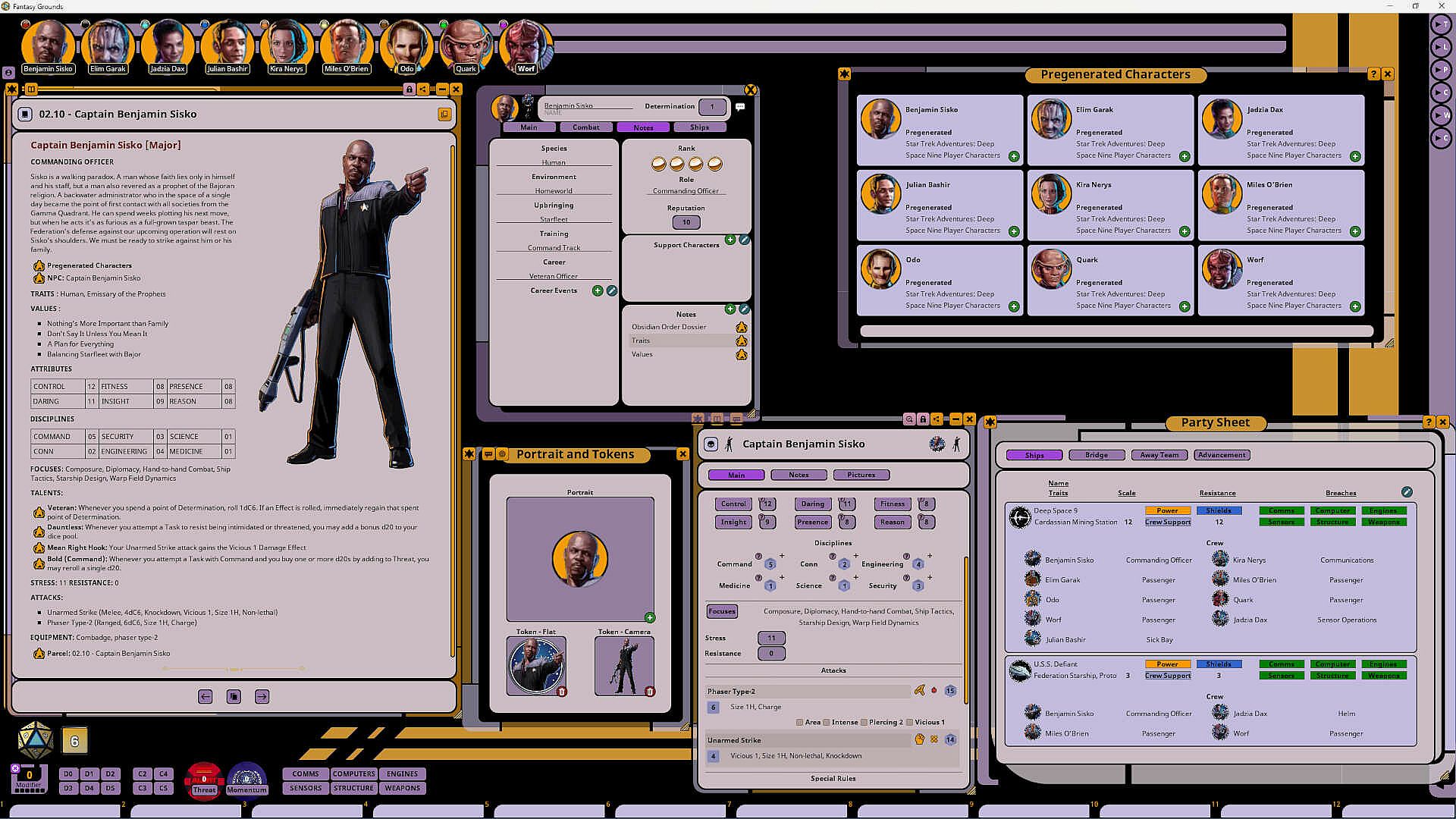 This Fantasy Grounds adaptation contains statistics for the crew and residents of Deep Space 9, including Pre-Generated Characters and NPC records for:- Captain Sisko