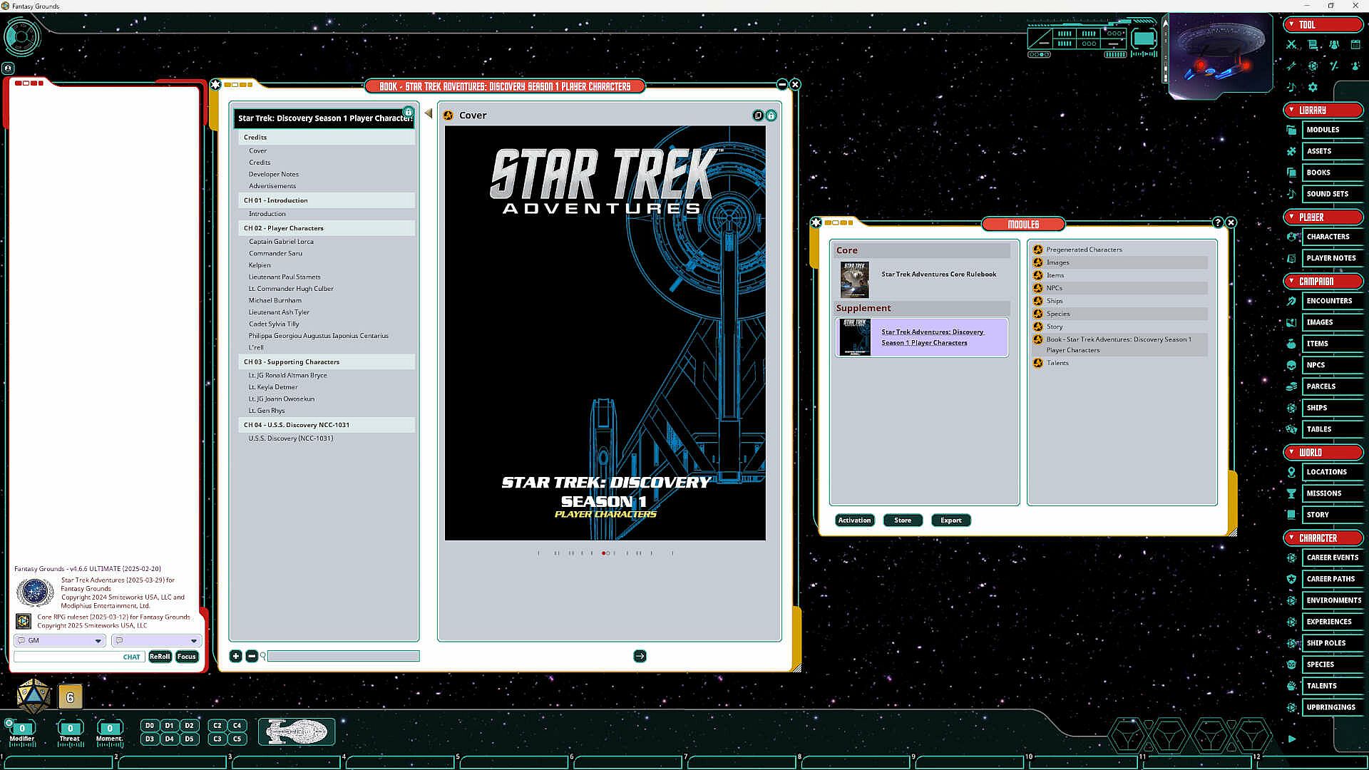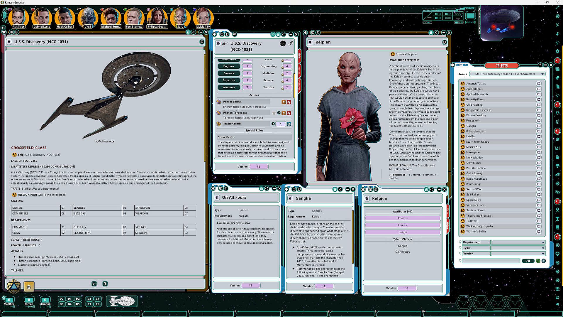 This Fantasy Grounds adaptation contains player character statistics for the crew of the U.S.S. Discovery NCC-1031 as seen in Season 1 of Star Trek: Discovery. The module includes Pre-Generated Characters and NPC records for: