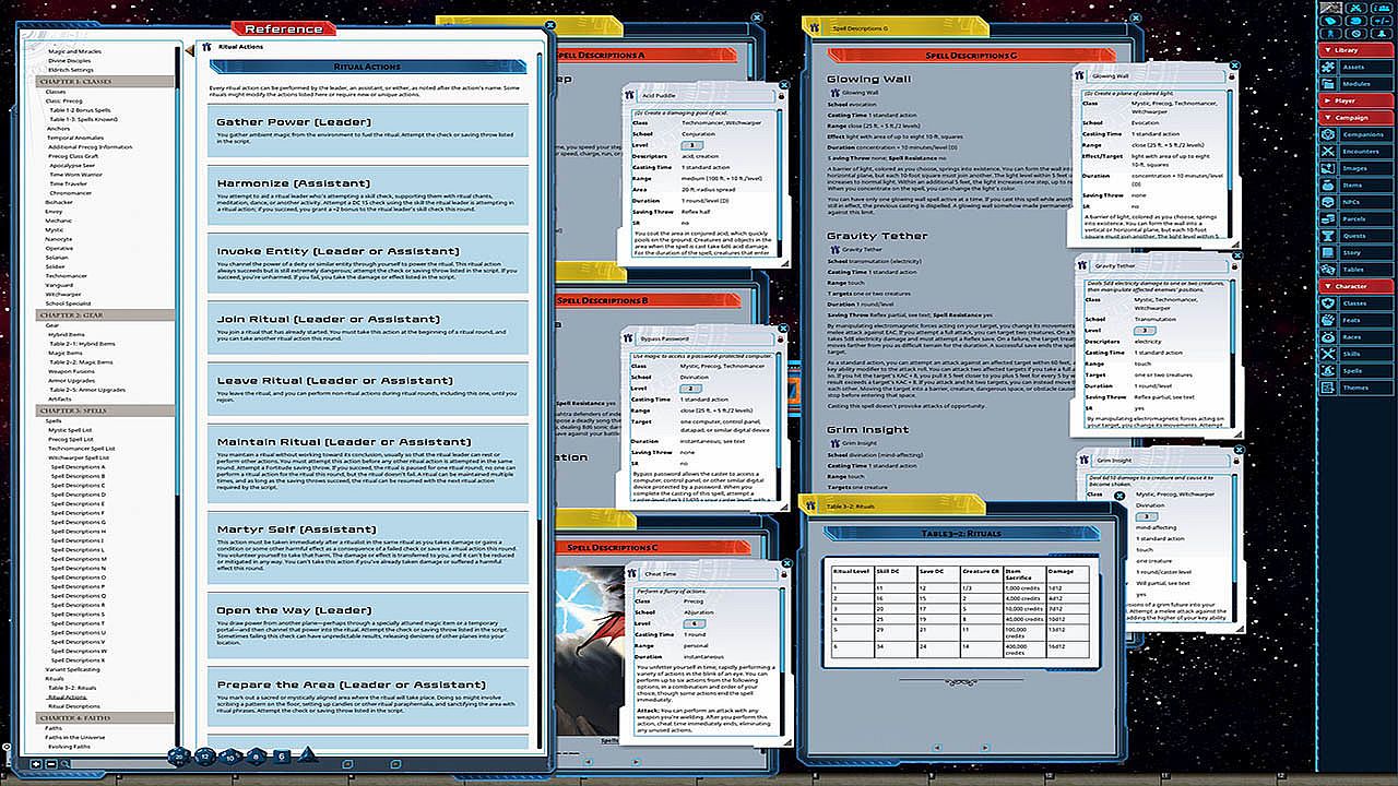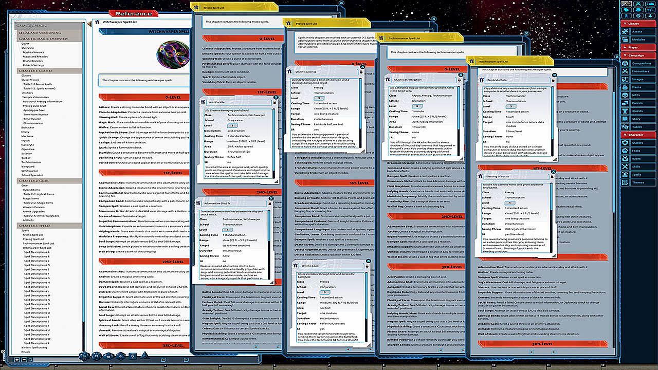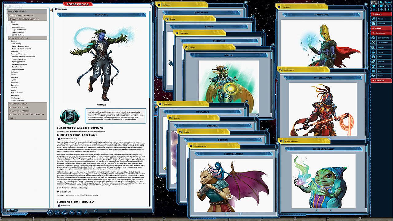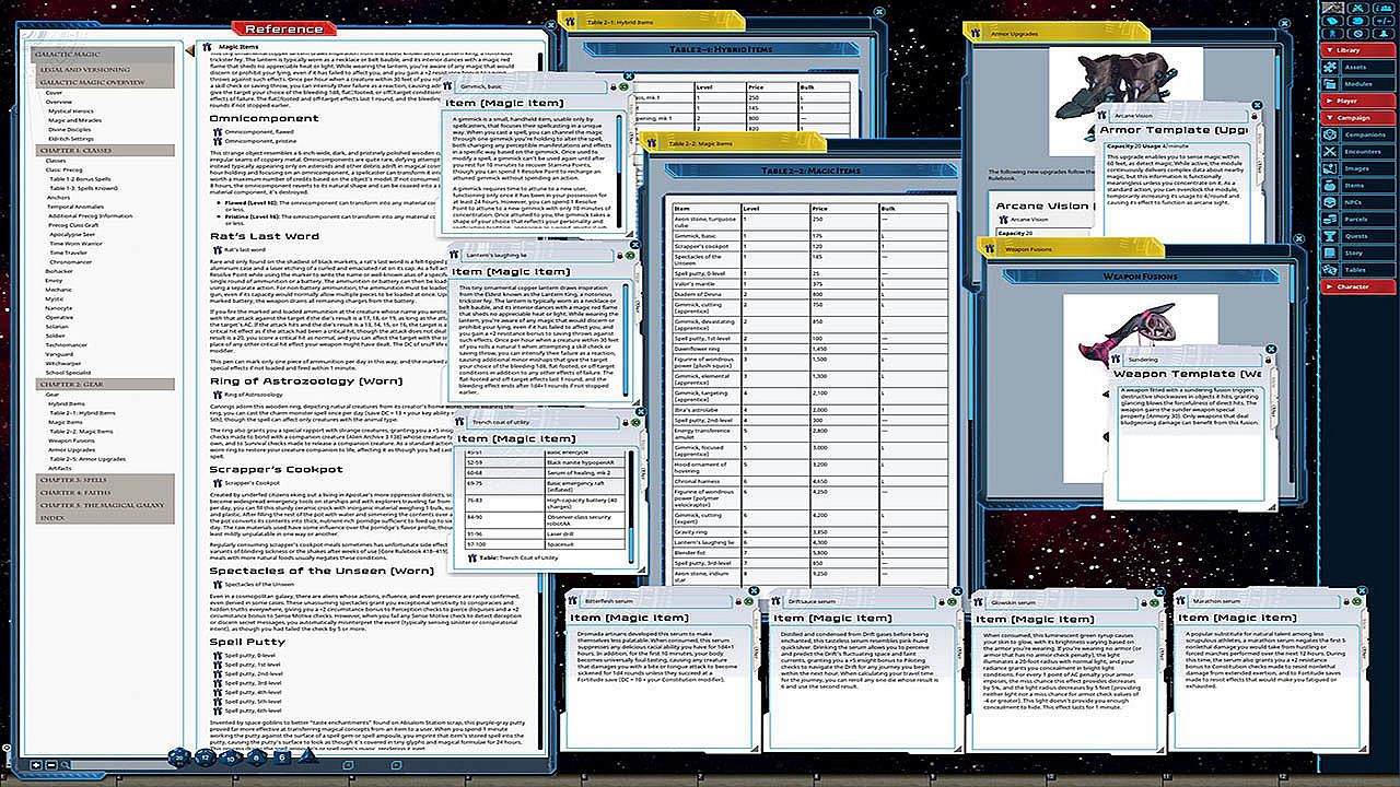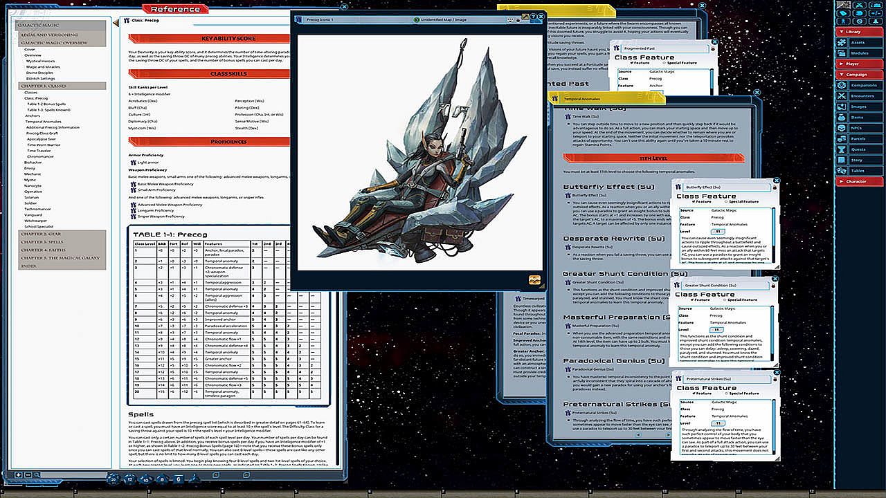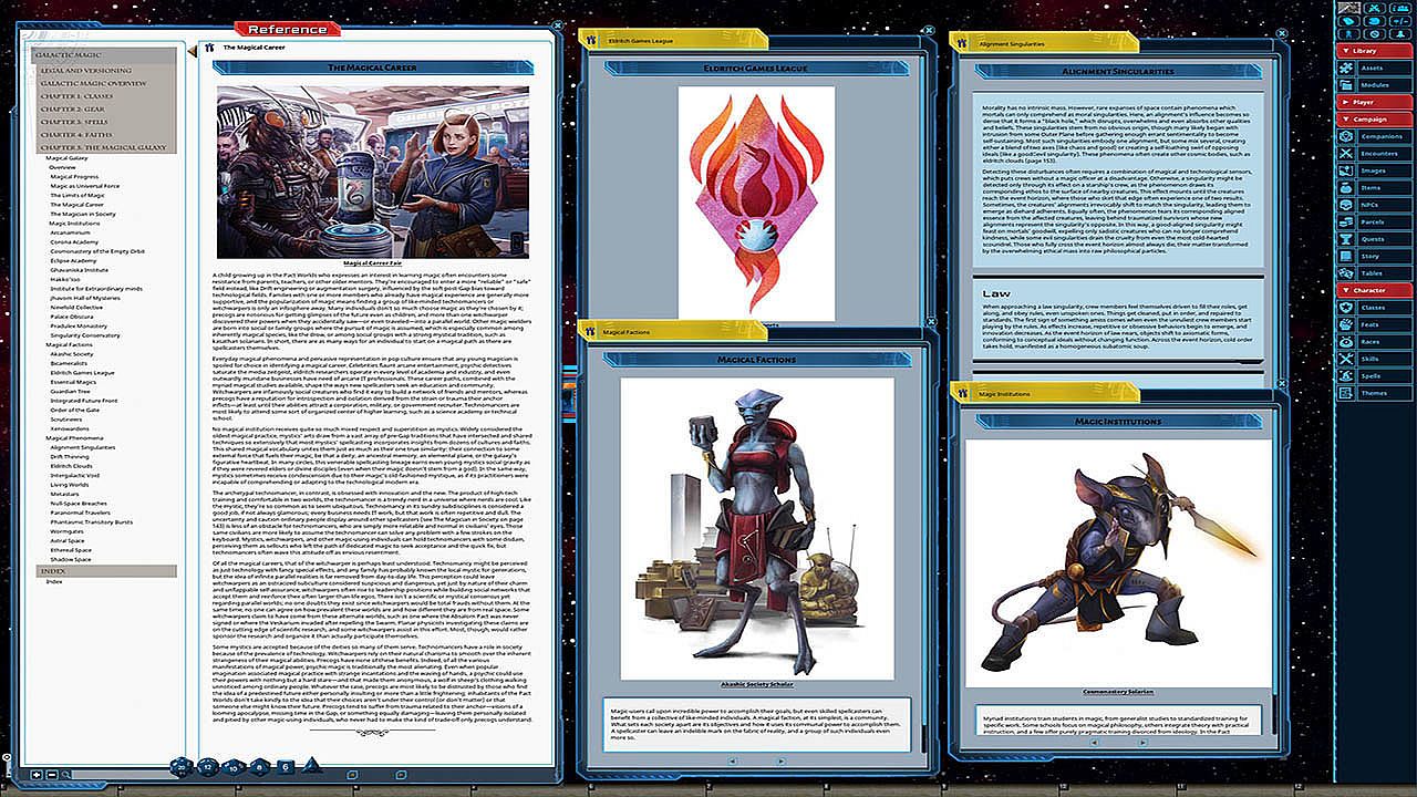 Unravel the eldritch mysteries of the galaxy! The new Galactic Magic hardcover rulebook for the Starfinder Roleplaying Game adds magical flair to any hero with a wealth of fantastical magic-infused character options for starfarers of any class! More than 100 spells, a host of powerful rituals, and an array of magic gear, hybrid items, and artifacts give you the edge to survive in a weird universe with lurking dangers at the end of every jump. The brand-new precog class allows you to see and change the future, relying on predictive prerolls to navigate clutch situations and quick reflexes to manipulate combat. Study arcana among the stars with a host of new magical organizations and spellcasting schools or petition higher powers using new faith-based options tied to the galaxy's gods and philosophies. Whatever your path to magical might, Galactic Magic is your guide!This product is not a PDF or accessible outside of Fantasy Grounds. It has been lovingly converted for use within Fantasy Grounds and features the following additions:
