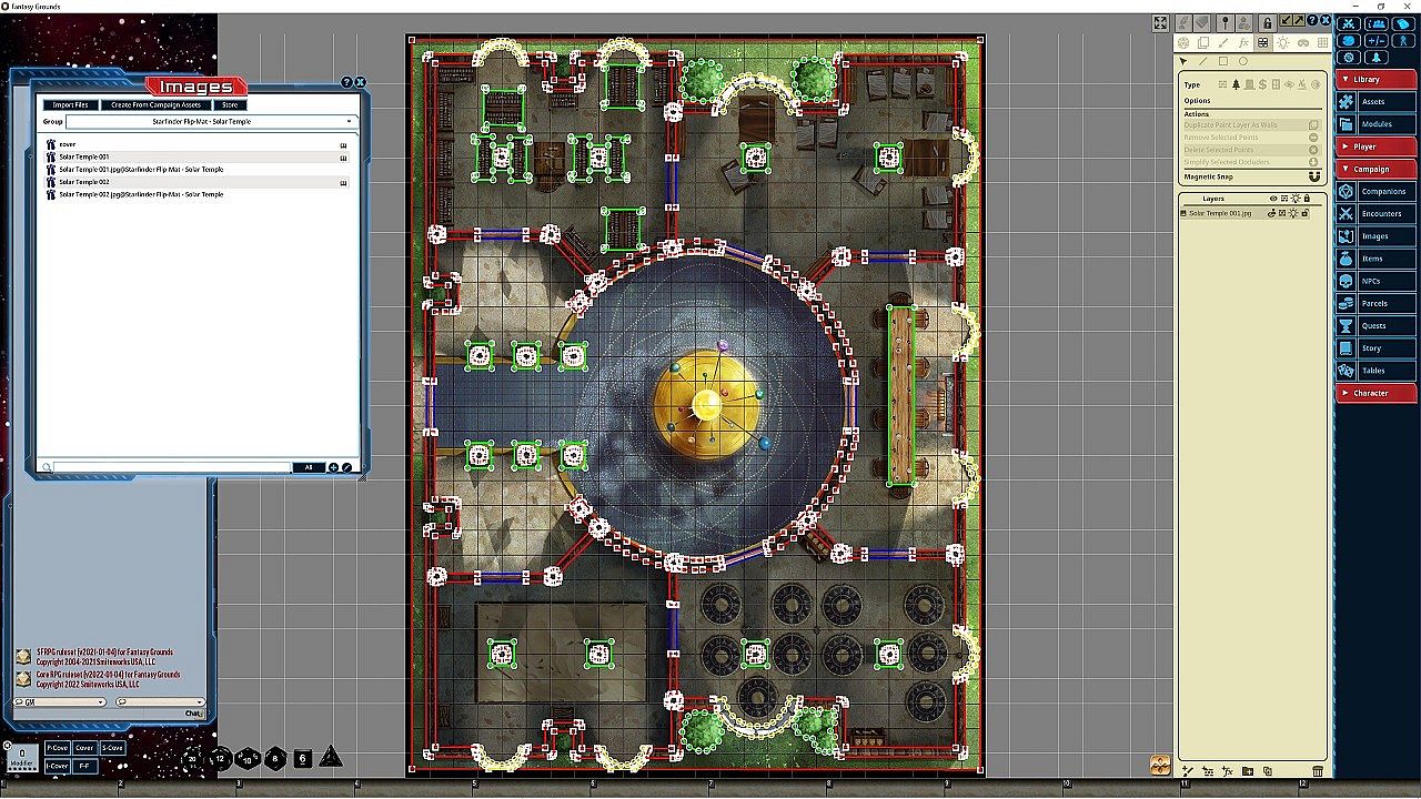 Whether the heroes are mastering the secrets of supernovas and black holes under the tutelage of a master solarian or defending mystics in the glare of a once-in-a-lifetime solar flare eruption, no Game Master wants to spend time drawing every meditation room and training courtyard. Fortunately, with Paizo's latest Starfinder Flip-Mat, you don't have to! This line of gaming maps provides ready-to-use science-fantasy set pieces for the busy Game Master. These maps feature an ancient solarian hermitage and a futuristic cloister in space. Don't waste time sketching when you could be playing. With Starfinder Flip-Mat: Solar Temple, you'll be ready the next time your players seek enlightenment among the stars!NOTE: This product has been made specifically for the Starfinder ruleset, but can be used for 5E, Pathfinder, or any ruleset supported by Fantasy Grounds