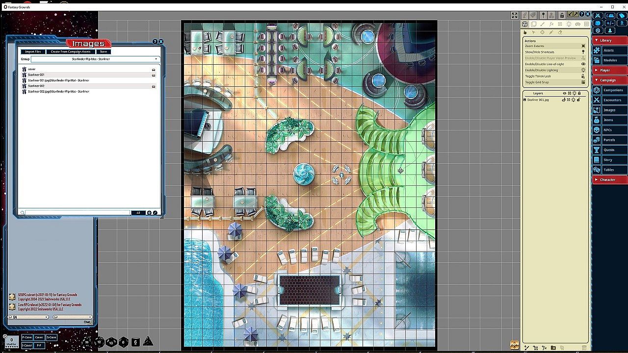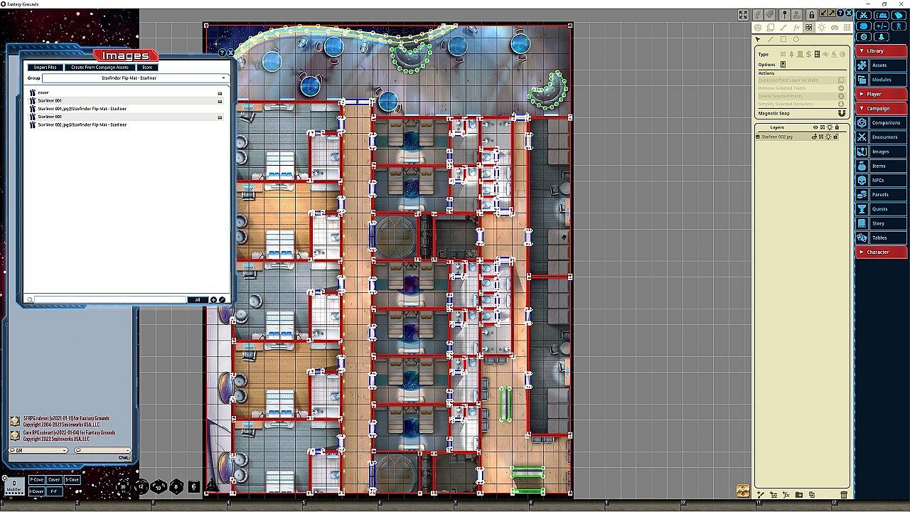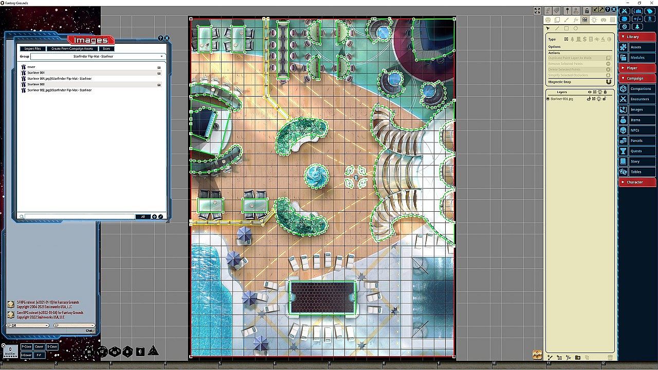Whether the heroes are investigating a mysterious murder among the passengers of an interstellar cruise ship or journeying between distant ports of call on a galaxy-spanning voyage, no Game Master wants to spend time drawing every stateroom and lounge. Fortunately, with Paizo's latest Starfinder Flip-Mat, you don't have to! This line of gaming maps provides ready-to-use science-fantasy set pieces for the busy Game Master. These maps feature two decks of a luxurious starliner. Don't waste time sketching when you could be playing. With Starfinder Flip-Mat: Starliner, you'll be ready the next time your players take a cruise!NOTE: This product has been made specifically for the Starfinder ruleset, but can be used for 5E, Pathfinder, or any ruleset supported by Fantasy Grounds