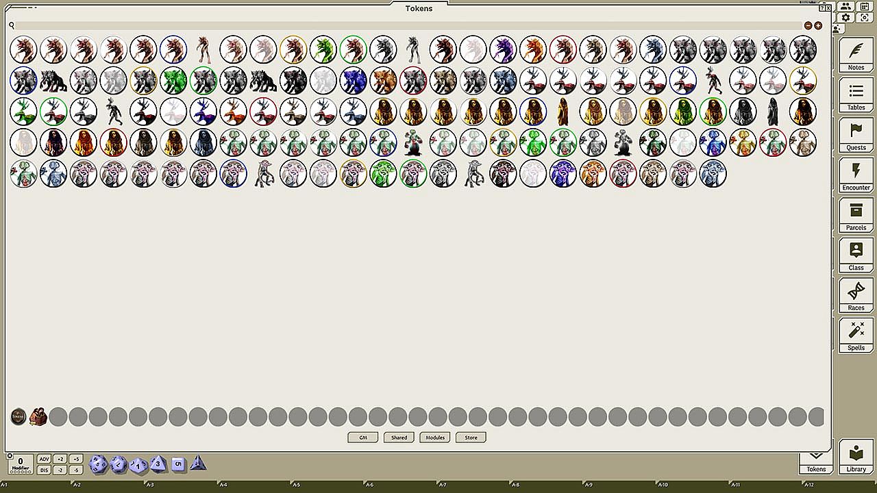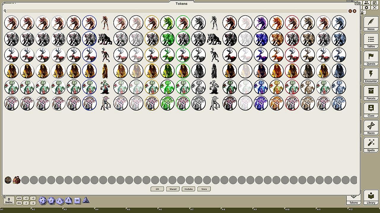 This token pack includes (ringed in black, blue, gold, green, greyscale, and silver, as well as ethereal, invisible, stone-skinned, sand-skinned, and altered state versions):