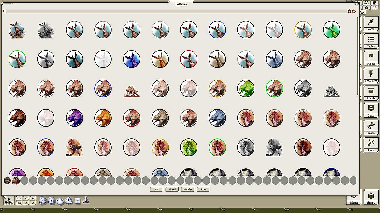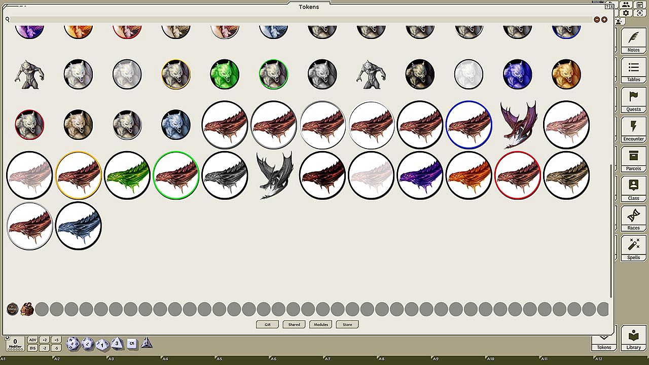 This token pack includes (ringed in black, blue, gold, green, greyscale, and silver, as well as ethereal, invisible, stone-skinned, sand-skinned, and altered state versions):