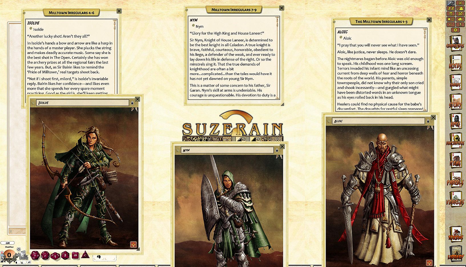 The Milltown Irregulars a ragtag bunch of pregenerated characters designed for Caladon Falls. There is a wide selection of characters to fit almost any player.The characters are Aloic the Crusader, Eiohna the Druid Dryad, Gris the Hunter, Isolde the Archer, Kayth the Protector, Larin the House Spy, Sir Nym the House Knight, Raelyn the Enchanter, and Tyrnan the Mercenary.