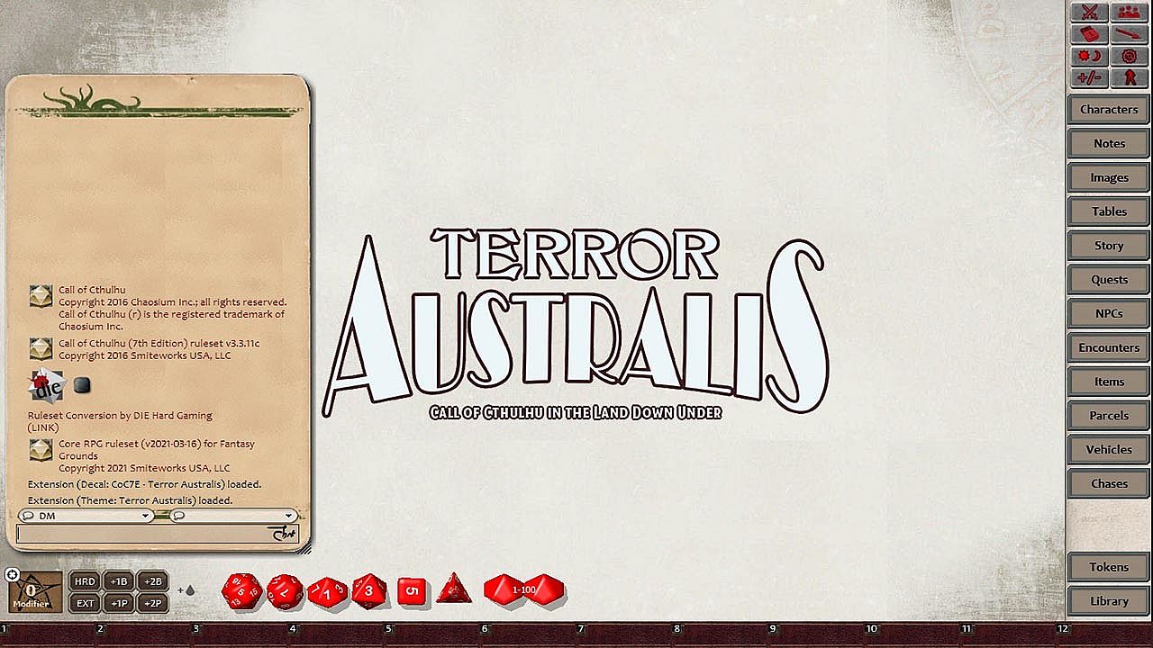 Requires: An active subscription or a one time purchase of a Fantasy Grounds Full or Ultimate license and a one time purchase of the Call of Cthulhu 7E ruleset. Compatible with Fantasy Grounds Unity or Fantasy Grounds Classic