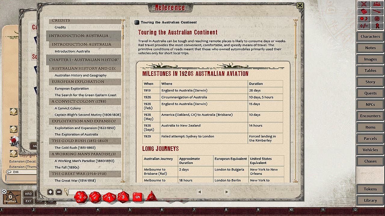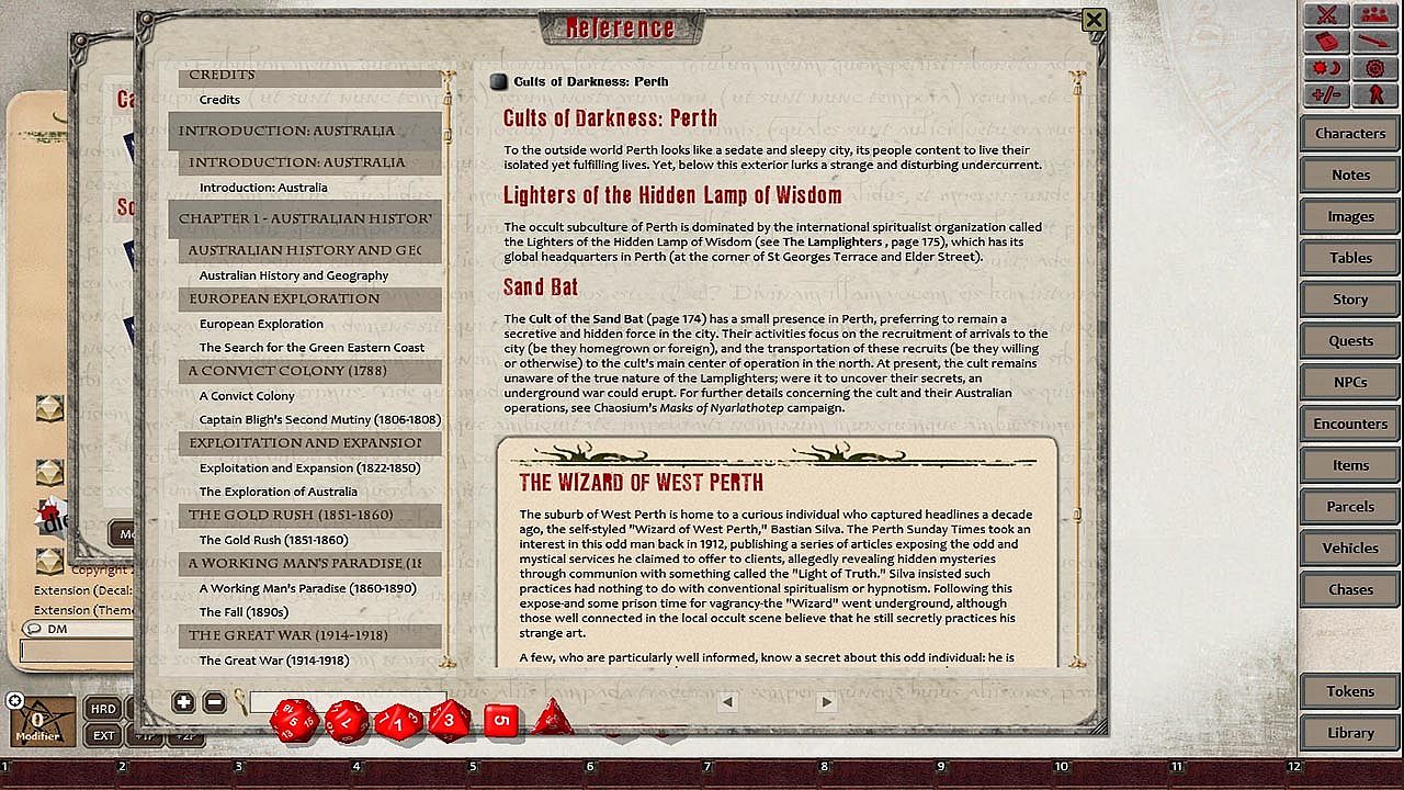 Gathered in the appendices are some of Australia's deadly wildlife, with game profiles provided for their use in games, as well as timelines covering Australia, and recommended further reading and viewing.