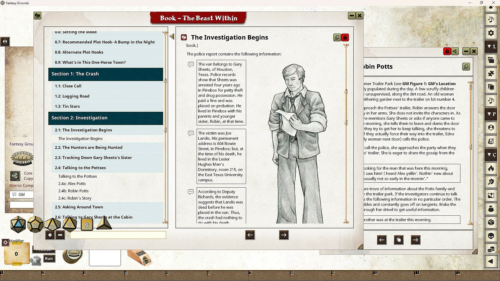 When an strange auto accident leads to a murder investigation, it's up to the heroes to uncover the true culprit. What is the connection between a college student and the stranger's van in which he was found? Was there someone else on that lonely stretch of highway? As the heroes follow the clues, they'd better watch their step. They are not the only hunters in Pinebox.The Beast Within is a modern horror adventure designed for four novice heroes and using the Savage Worlds game system . This adventure features equal parts investigation and deadly action, and is an excellent way to kick off your campaign in our setting-Pinebox, Texas.