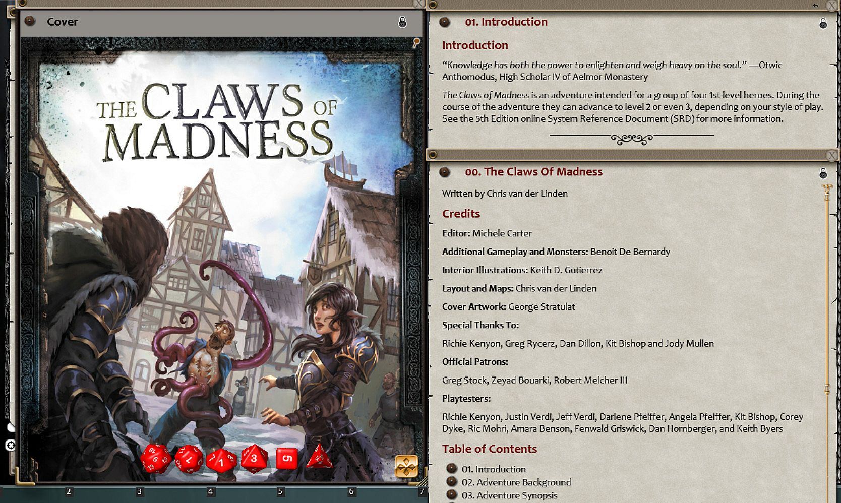 The Claws of Madness is a standalone 5th Edition adventure carefully designed for a group of 1st-level heroes, including new monsters, magic items, and a thrilling story arc. Edited by Michele Carter (co-editor of the 5th Edition Player’s Handbook), this dungeon crawl combines the best elements of classic adventures with fresh new exciting avenues. The story in this book also provides the perfect base for an epic, long-running campaign suitable for higher-level characters, in which the heroes unravel the dark mystery of the mythical Hand of Narkul . . .