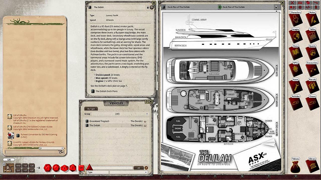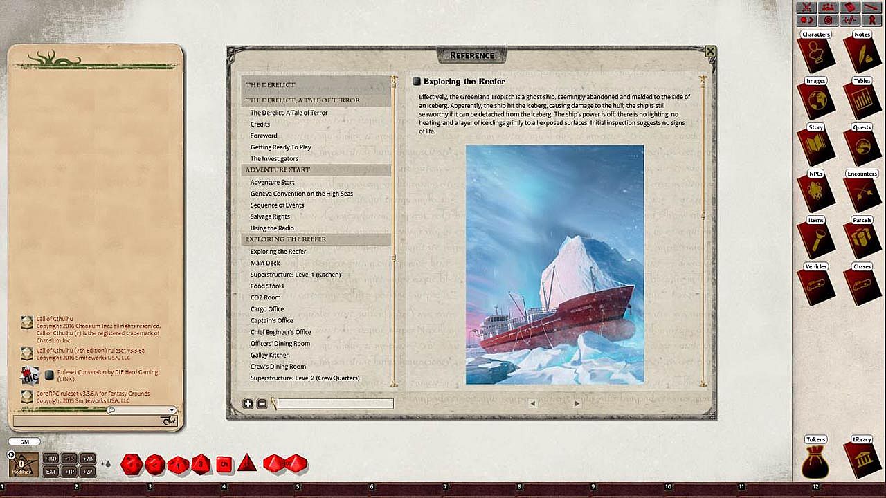 Requires: An active subscription or a one time purchase of a Fantasy Grounds Full or Ultimate license and a one time purchase of the Call of Cthulhu 7E ruleset.