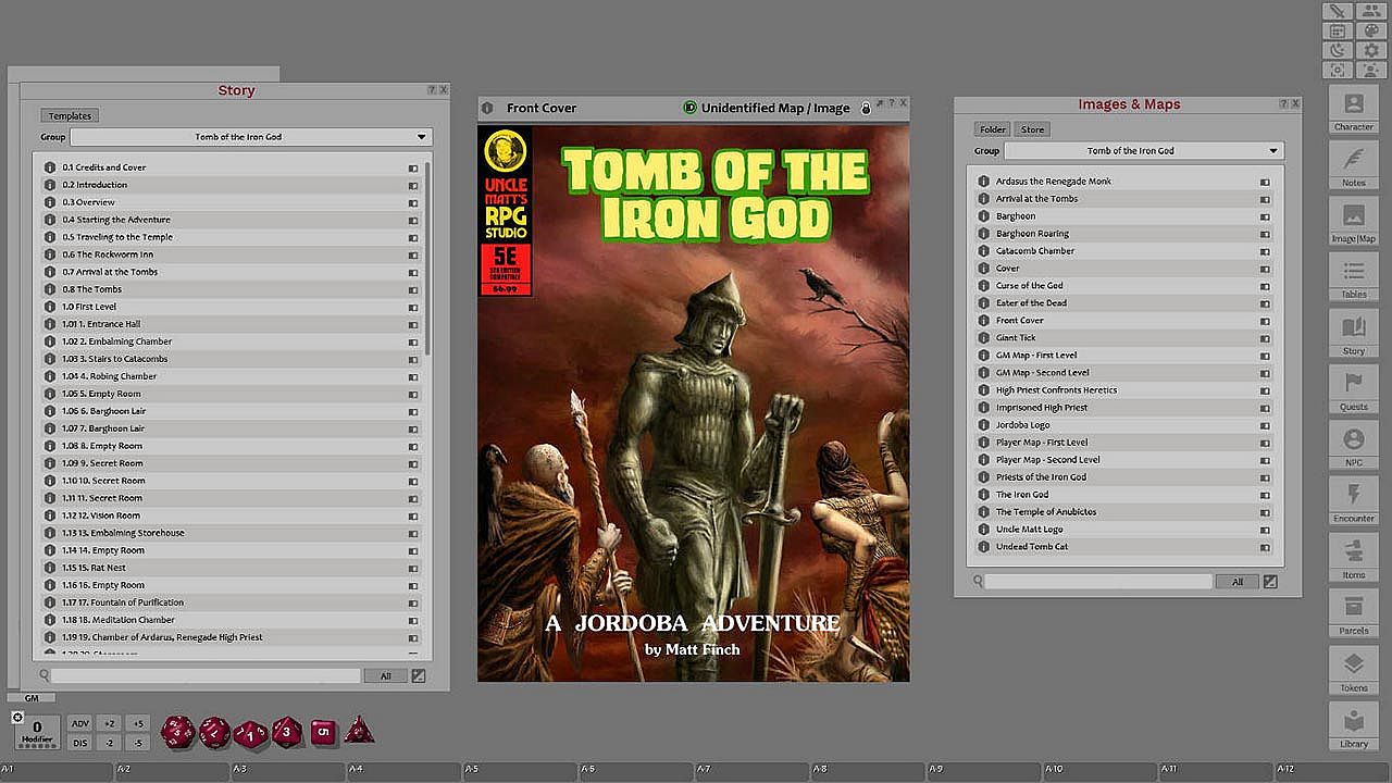 Tomb of the Iron God covers a large catacomb area on two levels, with 58 keyed locations and six new monsters. This is a fifth-edition dungeon crawl for four to five characters of 1st or 2nd level, by ENNIE-award winning author Matt Finch.
