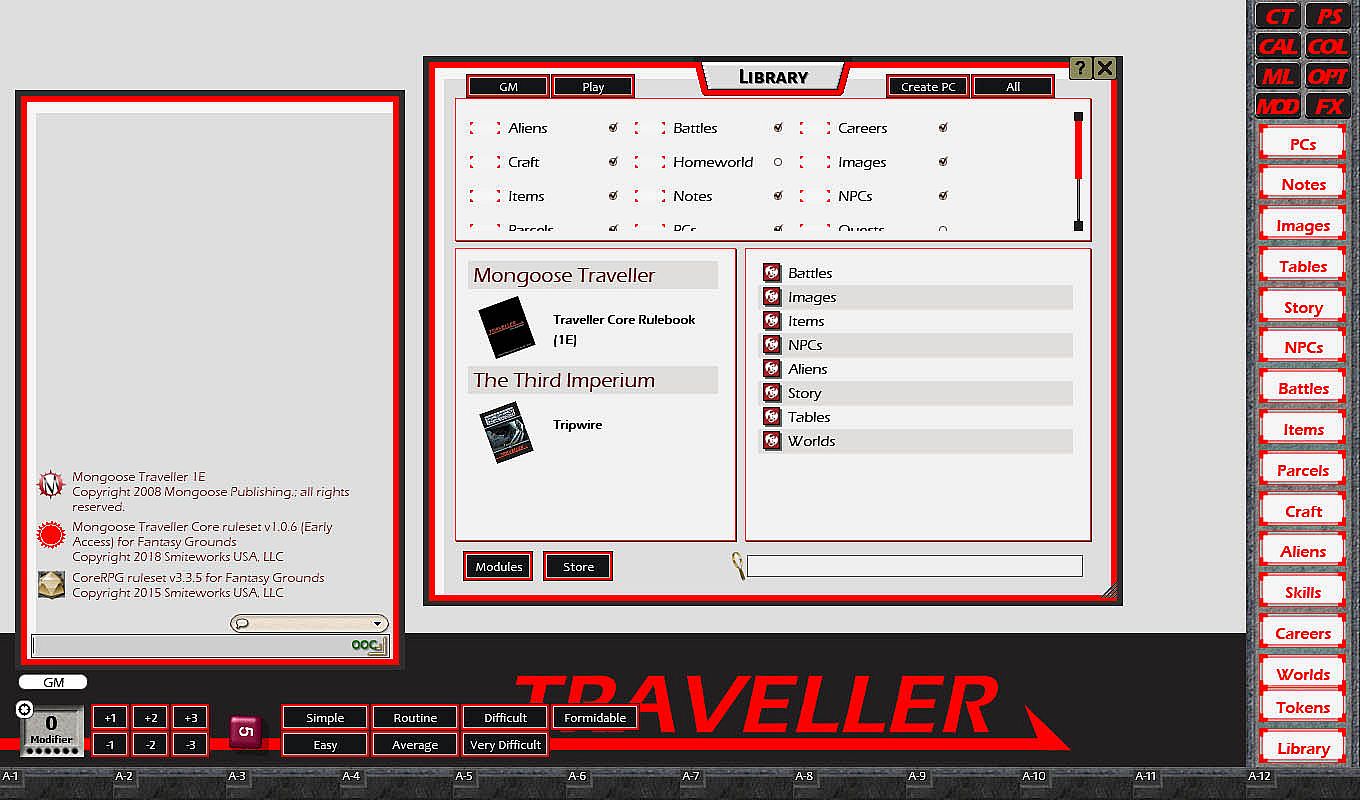 Requires: An active subscription or a one time purchase of a Fantasy Grounds Full or Ultimate license and a one time purchase of the Traveller 1E (Mongoose) ruleset.