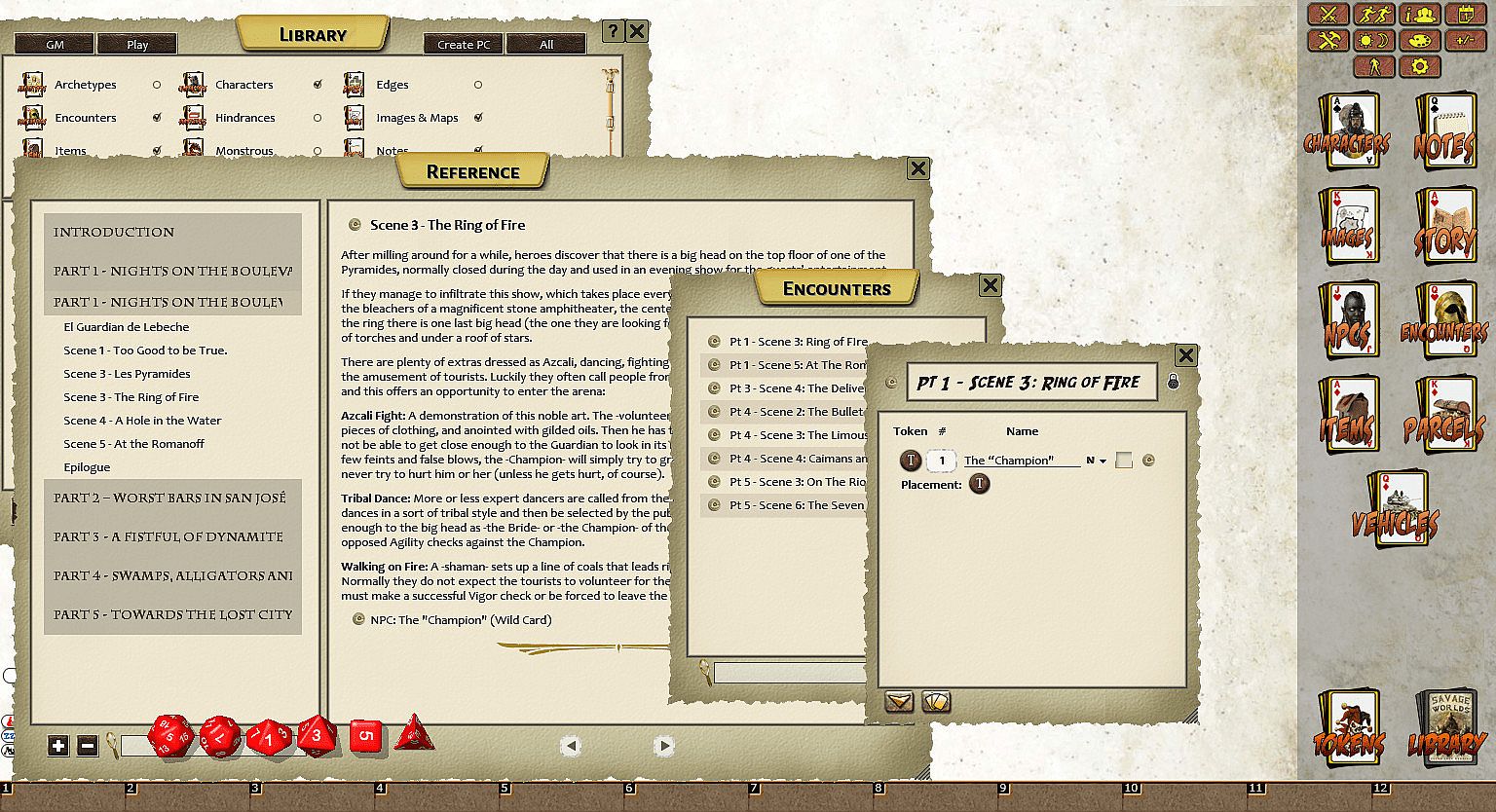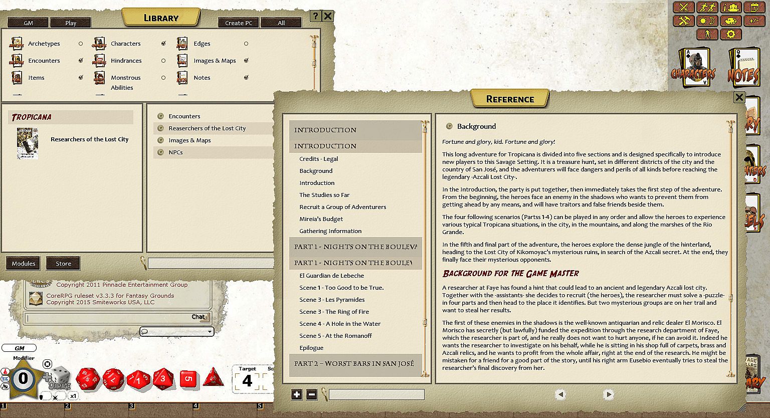 This long adventure for Tropicana is divided into five sections and is designed specifically to introduce new players to this Savage Setting. It is a treasure hunt, set in different districts of the city and the country of San José, and the adventurers will face dangers and perils of all kinds before reaching the legendary "Azcali Lost City".