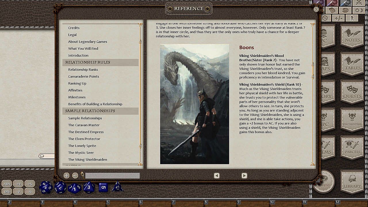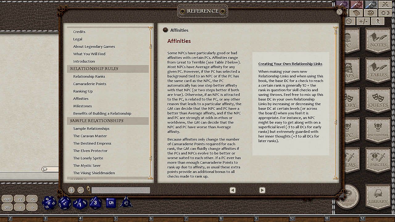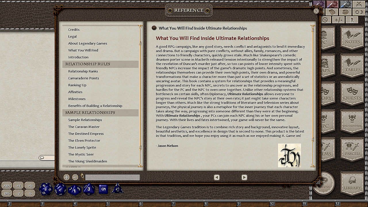 A good 5th Editioncampaign, like any good story, needs conflict and antagonists to lend it immediacy and drama, but a campaign with pure conflicts, without allies, family, romances, and other connections to friendly characters, quickly grows stale. Ultimate Relationships is your ideal toolbox for developing robust and engaging relationships between your heroes and the NPCs that inhabit the world around them, making them more than just a pile of statistics or an uncaring avatar but really helping your campaign world come to life!