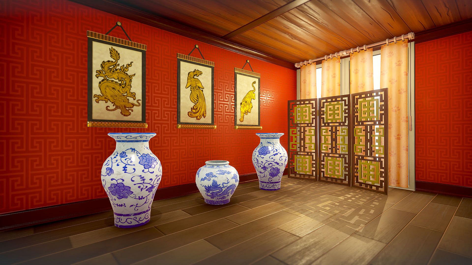• New house decorations: Porcelain Vases, Hanging Scrolls and Geometric Folding Screen
