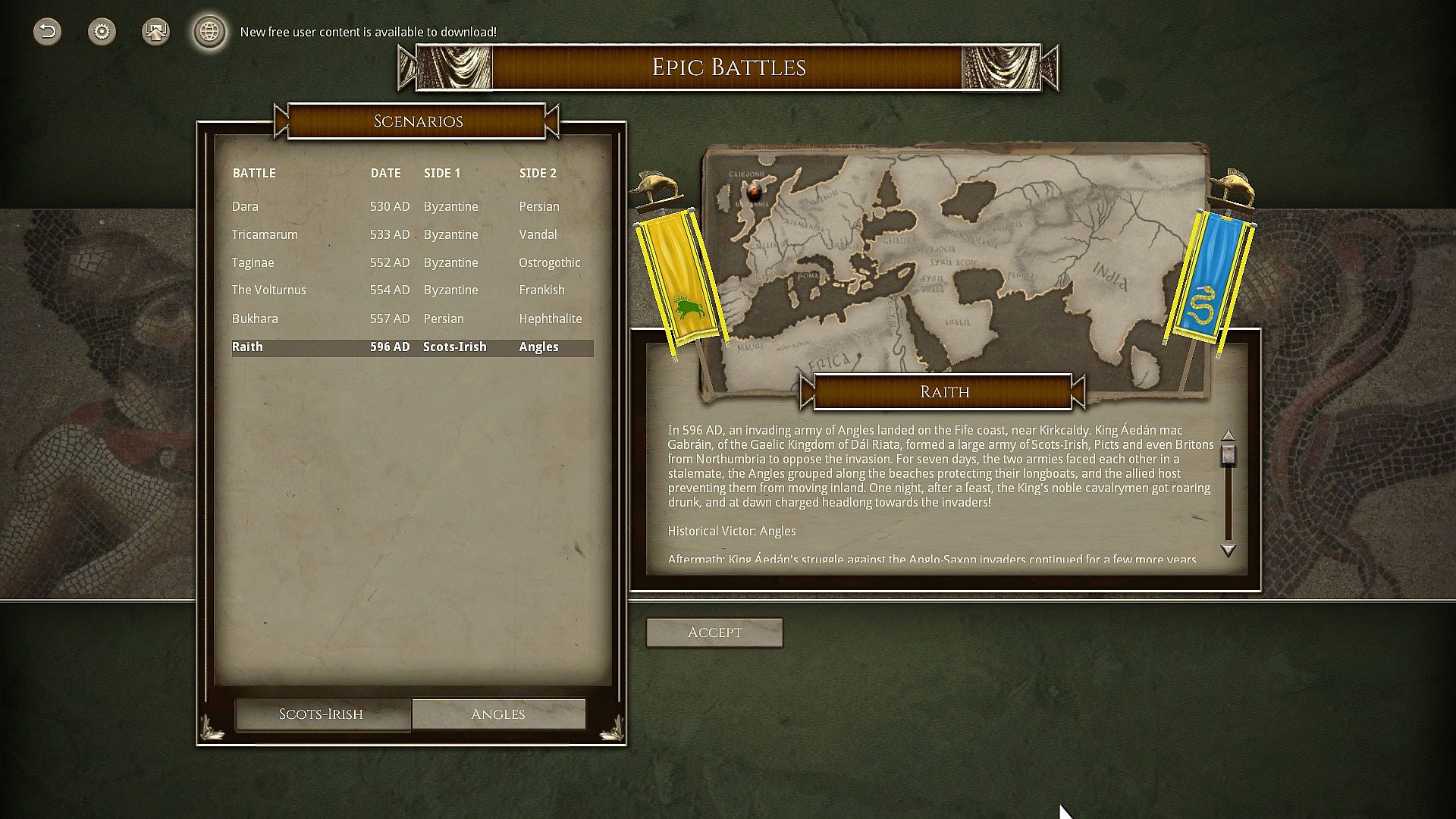 • 6 new Epic Battles: Dara 530 AD, Tricamarum 533 AD, Taginae 552 AD, The Volturnus 554 AD, Bukhara 557 AD, Raith 596 AD (each playable from either side).
