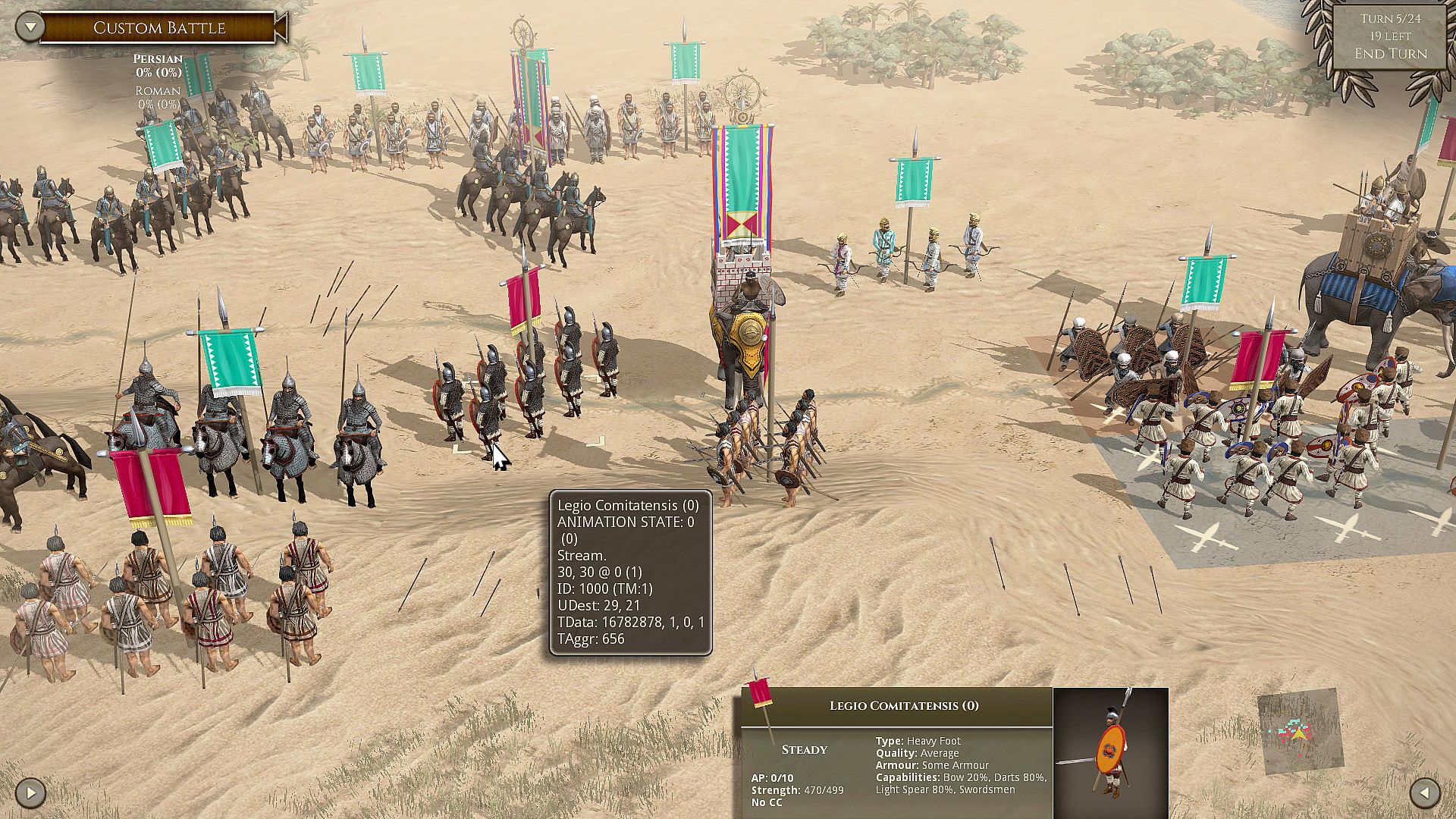 • 17 new units: Early Imperial Legionaries, Early Imperial Auxiliaries, Auxiliary Archers, Veteran auxiliary cavalry, Roman Lancers, Late Roman Lancers, Legio Palatina, Legio Comitatensis, Auxilia Palatina, Limitanii, Armoured Horse Archers, Expert Armoured Horse Archers, Fierce Nomad Horse Archers (Huns), Fierce Nomad Light Horse Archers (Huns), Irregular Foot (trousered), Pictish Spearmen and Jewish Zealots. Also the following that were available in the base game, but not used: Roman auxiliary cavalry, Sassanid levy spearmen.
