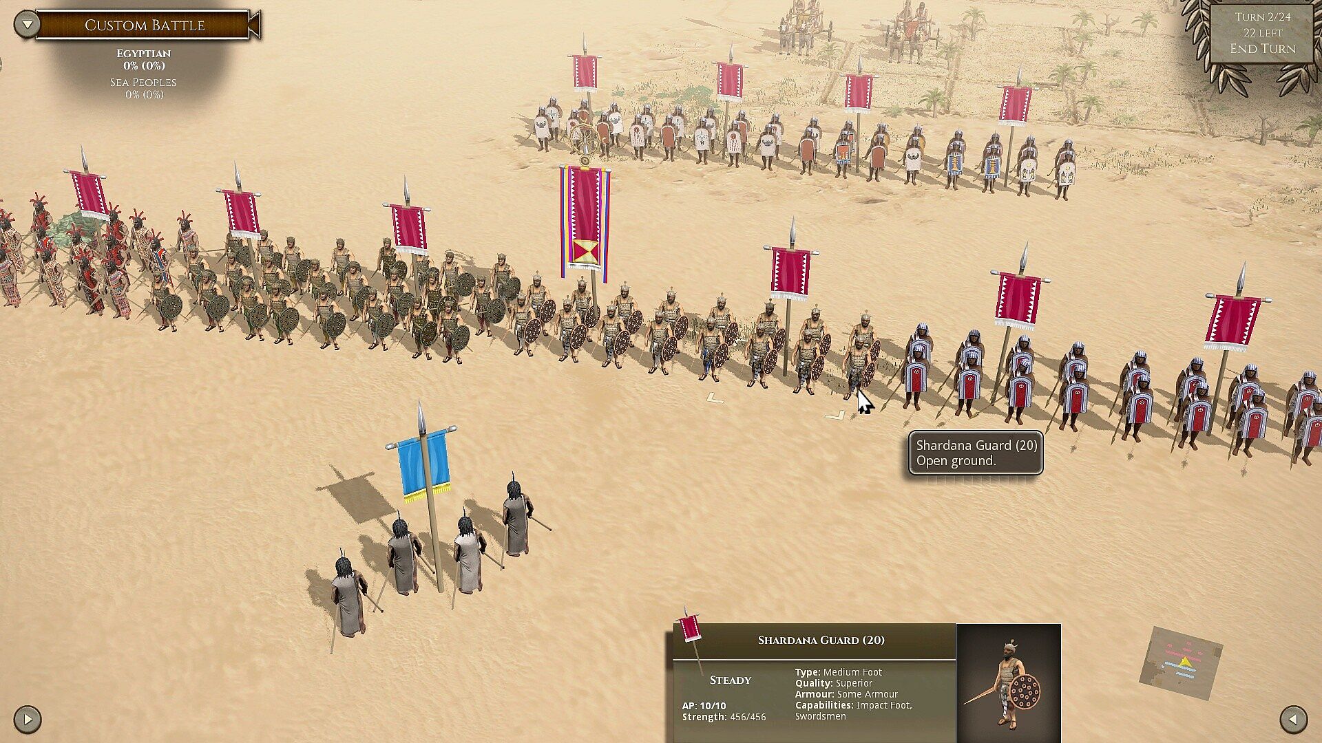 - 46 new units: Picked Sumerian/Akkadian Spearmen, Sumerian/Akkadian Spearmen, Sumerian/Akkadian Spearmen with Pavise, Raw Sumerian/Akkadian Spearmen with Pavise, Sumerian/Akkadian Battle Cars, Early Chariots (Spear), Early Chariots (Bow), Egyptian-style Light Chariots, Egyptian Close Fighters, Egyptian Guard, Shardana Guard, Sherden Swordsmen, (Other) Sea Peoples Swordsmen, Picked Sherden Swordsmen, Picked (other) Sea Peoples Swordsmen, Philistine Spearmen, Philistine Guard, Libyan Foot, Libyan Swordsmen, Libyan Light Javelinmen, Nubian Close Fighters, Nubian Light Javelinmen, Nubian Light Archers, Anatolian-style Light Chariots, Anatolian-style Heavy Chariots, Anatolian Spearmen, Syrian Spearmen, Maryannu Light Chariots, Ugaritic Heavy Chariots, Minoan/Mycenaean Heavy Chariots, Minoan-style Spearmen, Aegean Light Chariots, Sea Peoples Light Chariots, Libyan Light chariots, Mycenaean-style Spearmen, Myrmidons, Early Middle-Eastern Close Fighters, Gasgan Warriors, Zagros Warriors, Neo-Hittite-style Spearmen, Early Assyrian-style Cavalry, Anatolian Irregular Foot, Anatolian Light Javelinmen, Early mixed bow and spear infantry, Raw early mixed bow and spear infantry, Early Levies.