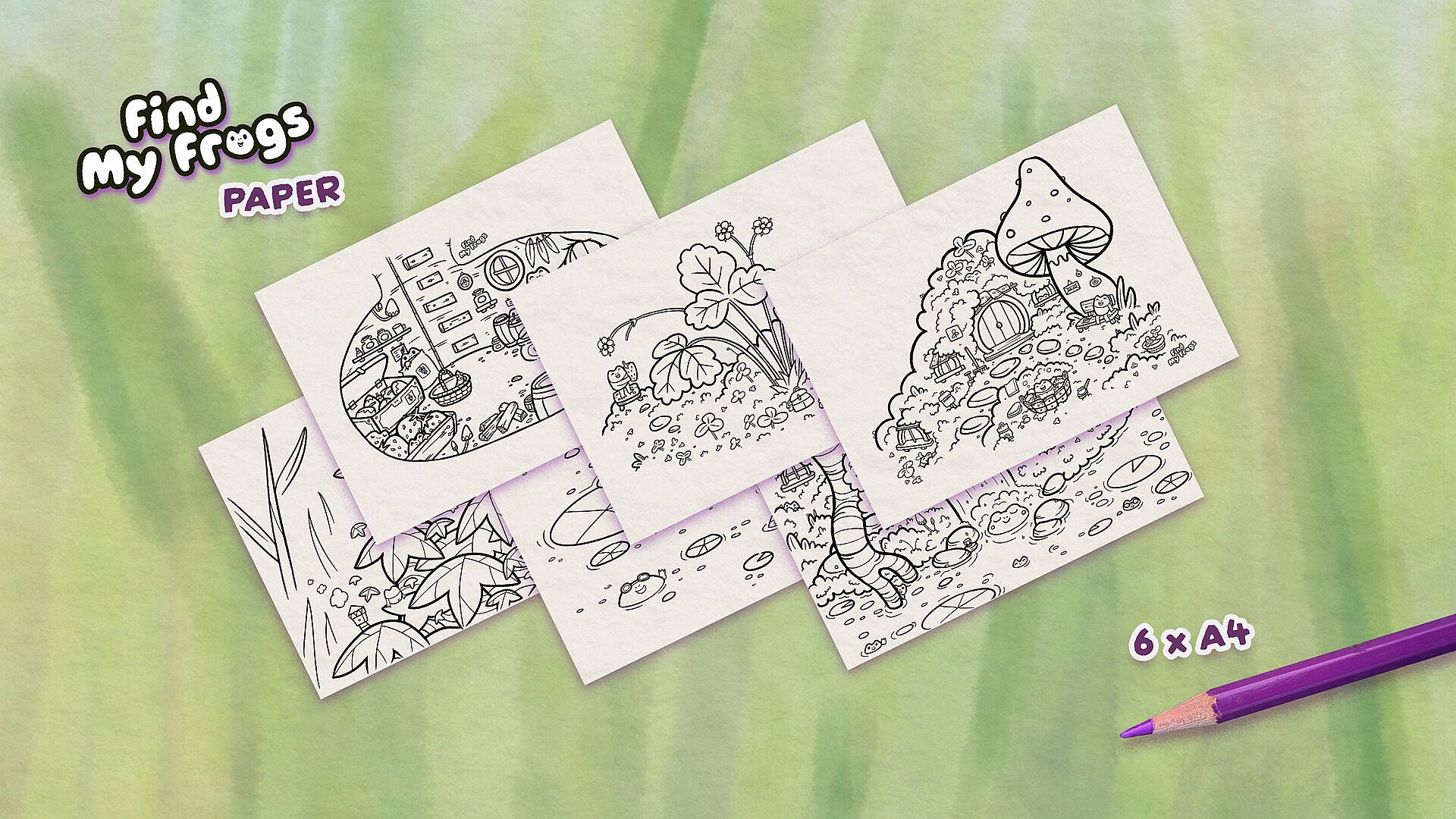 Find My Frogs - Paper are the printed version of characters and scenes from Find My Frogs game. Put your own colors on cute frogs and tiny scenes from Moss Glade.