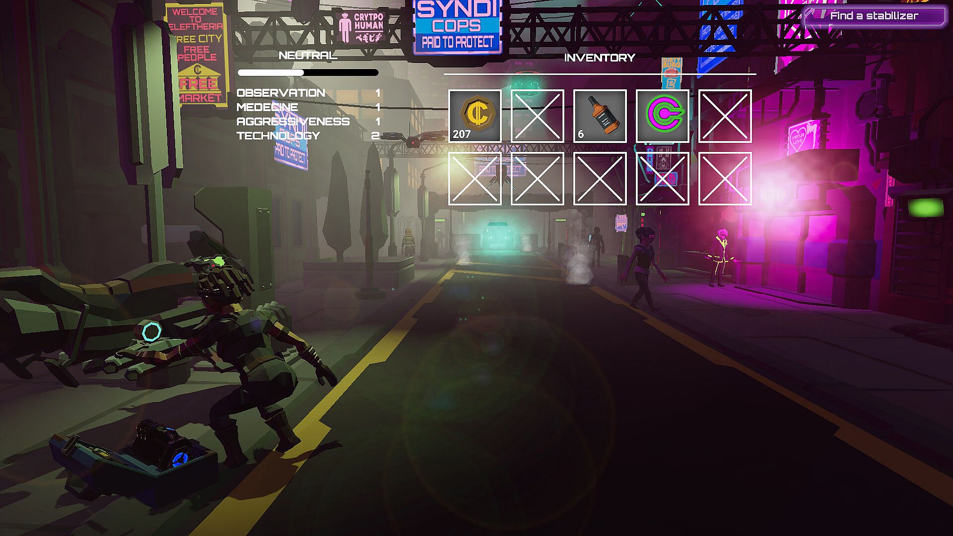 Earth has become a giant city, private corporations have replaced governments and public services. To escape from this urban hell, people seek refuge in legal cyberdrugs, delivered directly from networks to their neural implants. Hackers also deal illegal versions of these drugs. The deadliest one is called Wild Dose.You are one of these many cyberjunkies. Walk the slums of Eleftheria, discover the stories of its citizens, follow the rules or rebel against the system. Fulfill private contracts or execute tasks for your fellow citizens to buy your next dose.