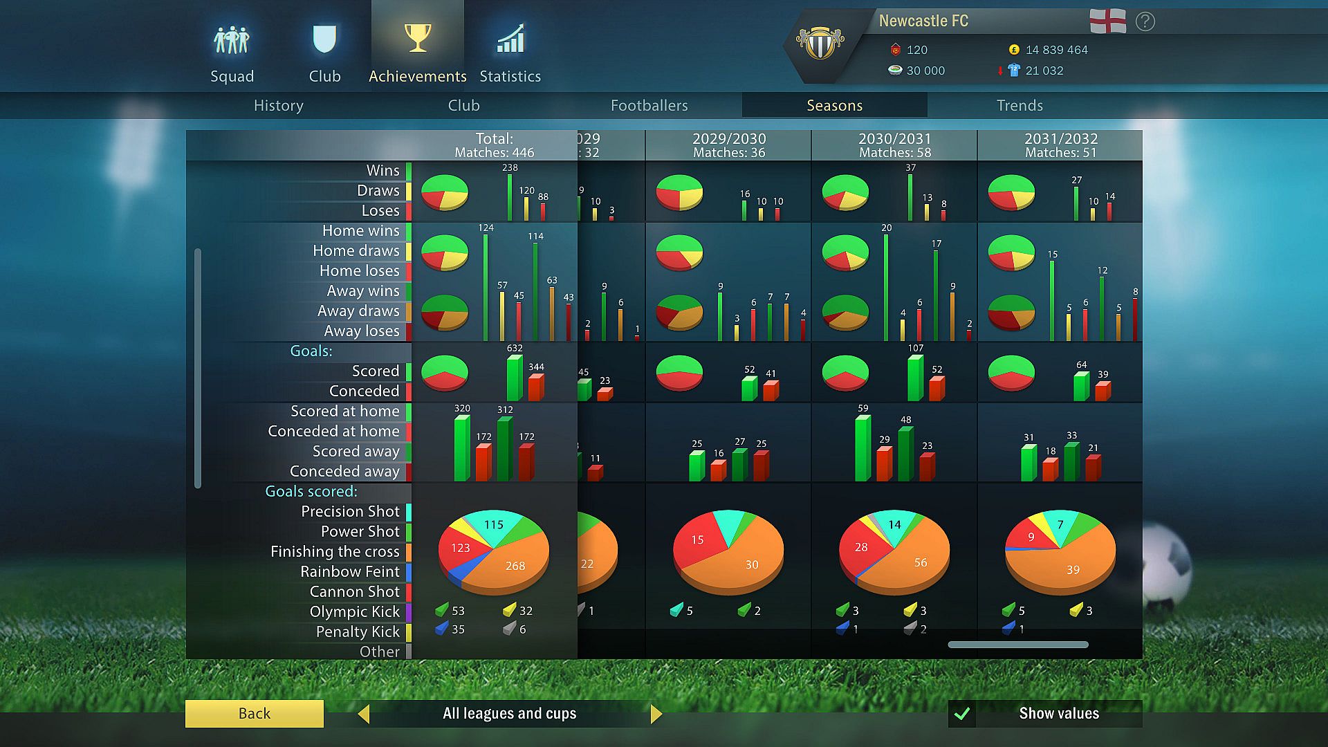 Various statistics from previous and current seasons are now saved and analyzed. You can indulge in the past glory of your club, and adopt better future tactics through the many graphs, charts, and statistical summaries!