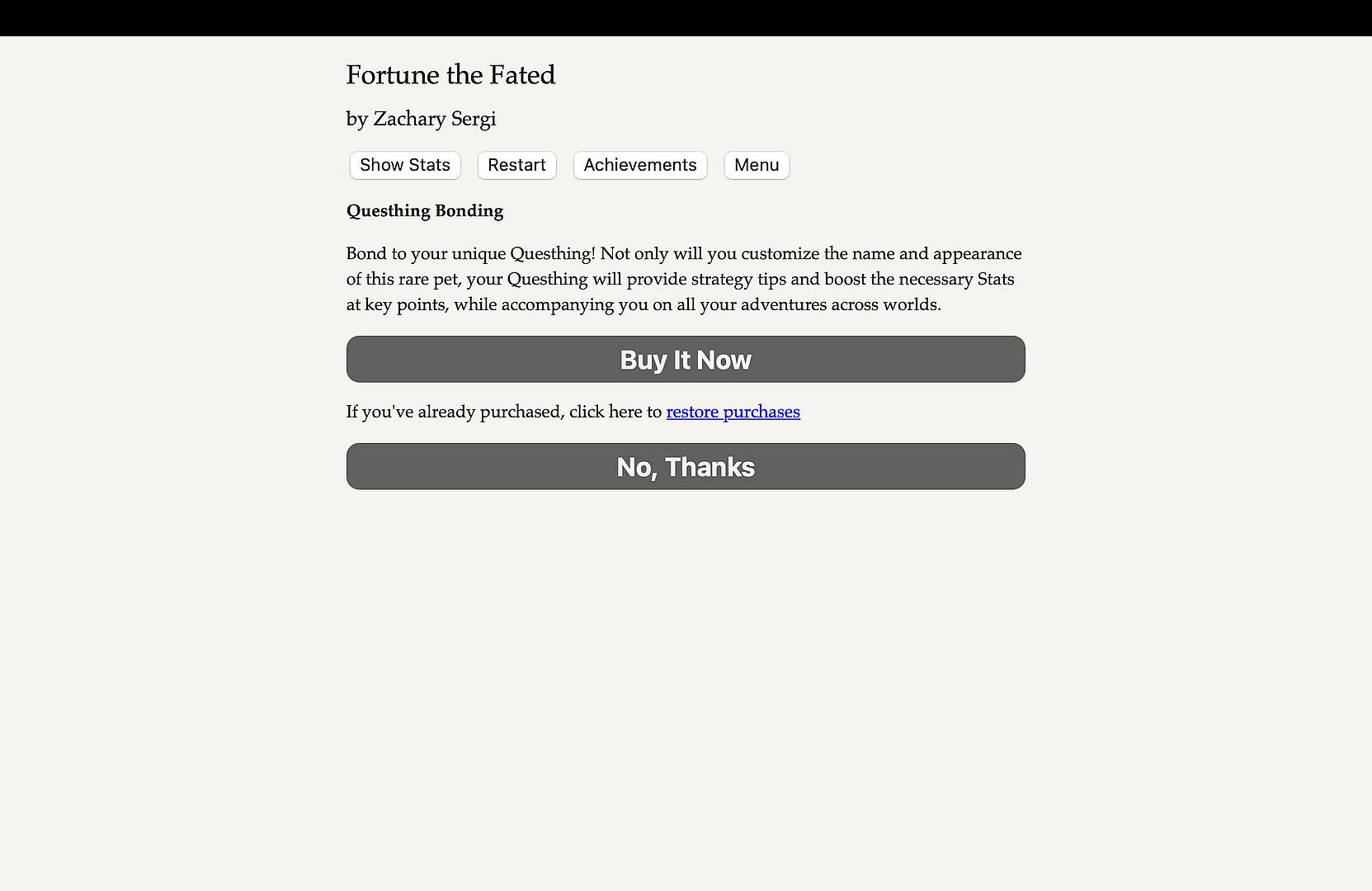 Before you start looking for a cheap Fortune the Fated — Questhing Bonding CD Key, take a moment to check the essentials. Developed by Hosted Games. PC released date: 19 Jan 2023. Genres: Indie, RPG, Casual. Categories: Family Sharing, Single-player, Downloadable Content, Steam Achievements, Steam Cloud.