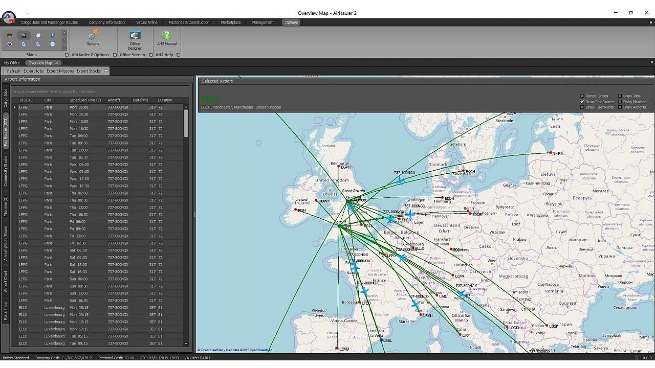 Expand your company into an online Virtual Airline where other pilots can fly passenger routes and cargo jobs for your new venture – select jobs from a global shared job board and allow users to help you manage your virtual airline and fly, expand and maintain your fleet!