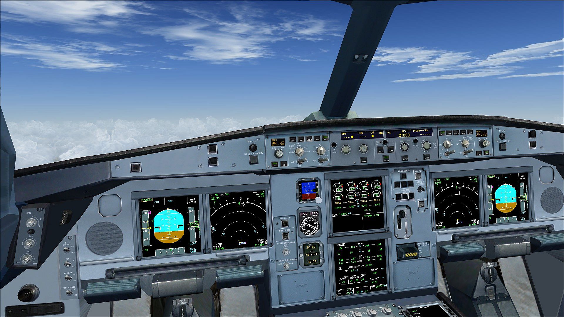 - All the Airbus EFIS are available: Primary Flight Display (PFD), Navigation Display (ND), Engine/Warning Display (E/WD), System Display (SD), with all the system pages available.