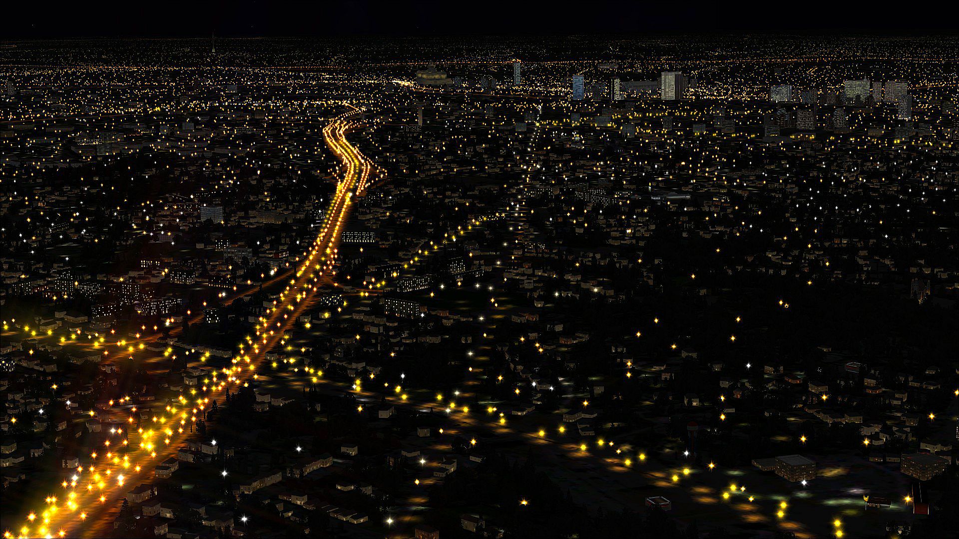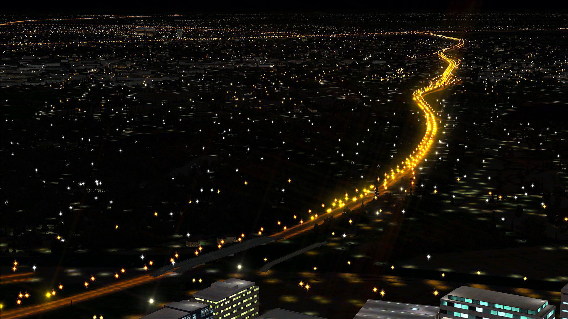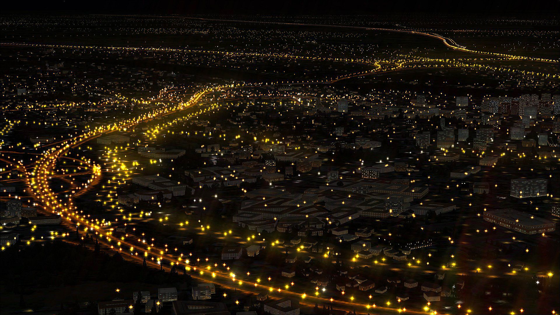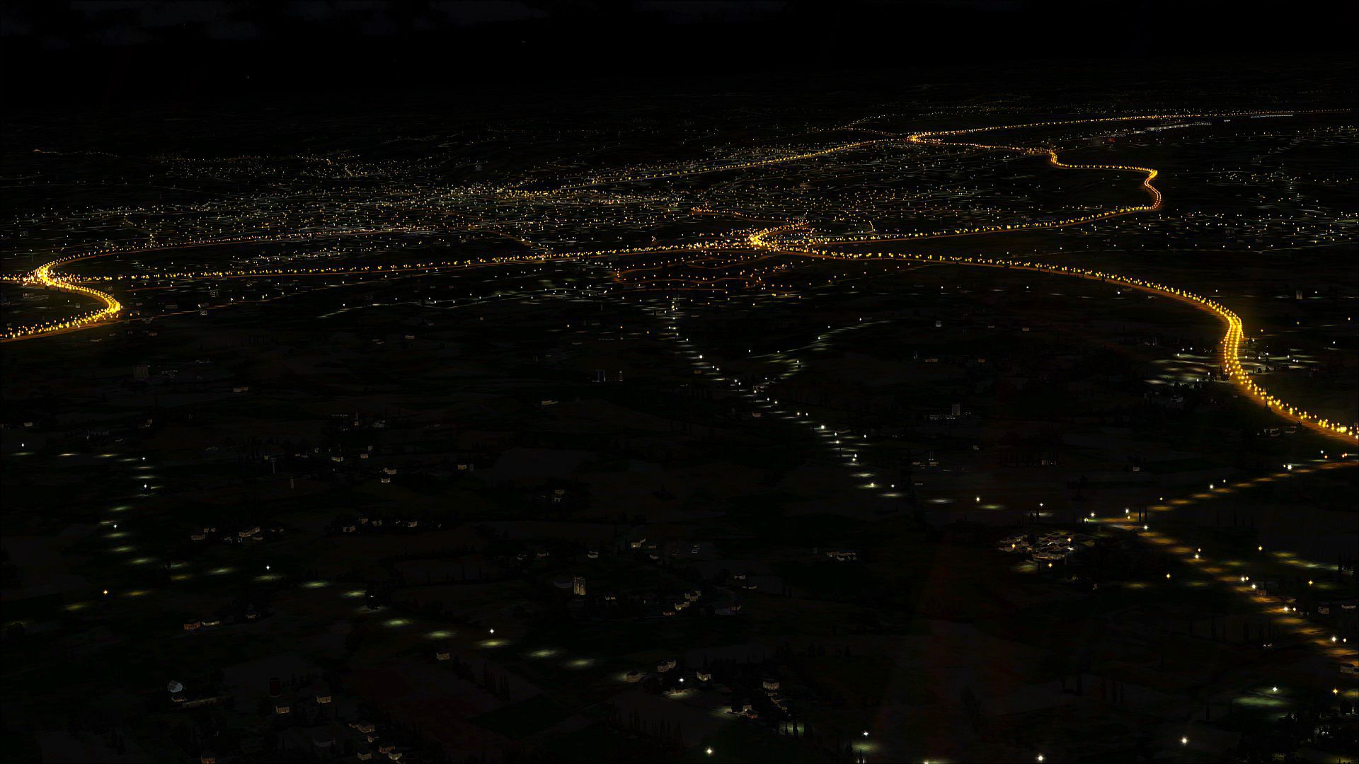 The Night Environment database contains an incredible amount of accurate road data, illuminating roads at night which you wouldn’t normally see. Our lights have up to a 60 mile radius, so large urban areas and highway junctions will illuminate all around you as you fly. As the highway lights are raised above the surface and have a lit bitmap below them, a realistic 3D effect is created.
